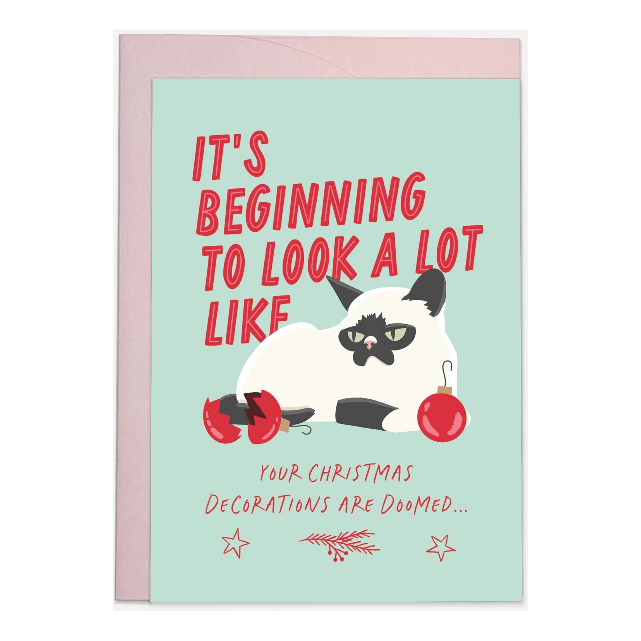 Send laughs with the Decorations Doomed Christmas Card, a festive and funny design featuring a mischievous cat ready to ruin the tree.