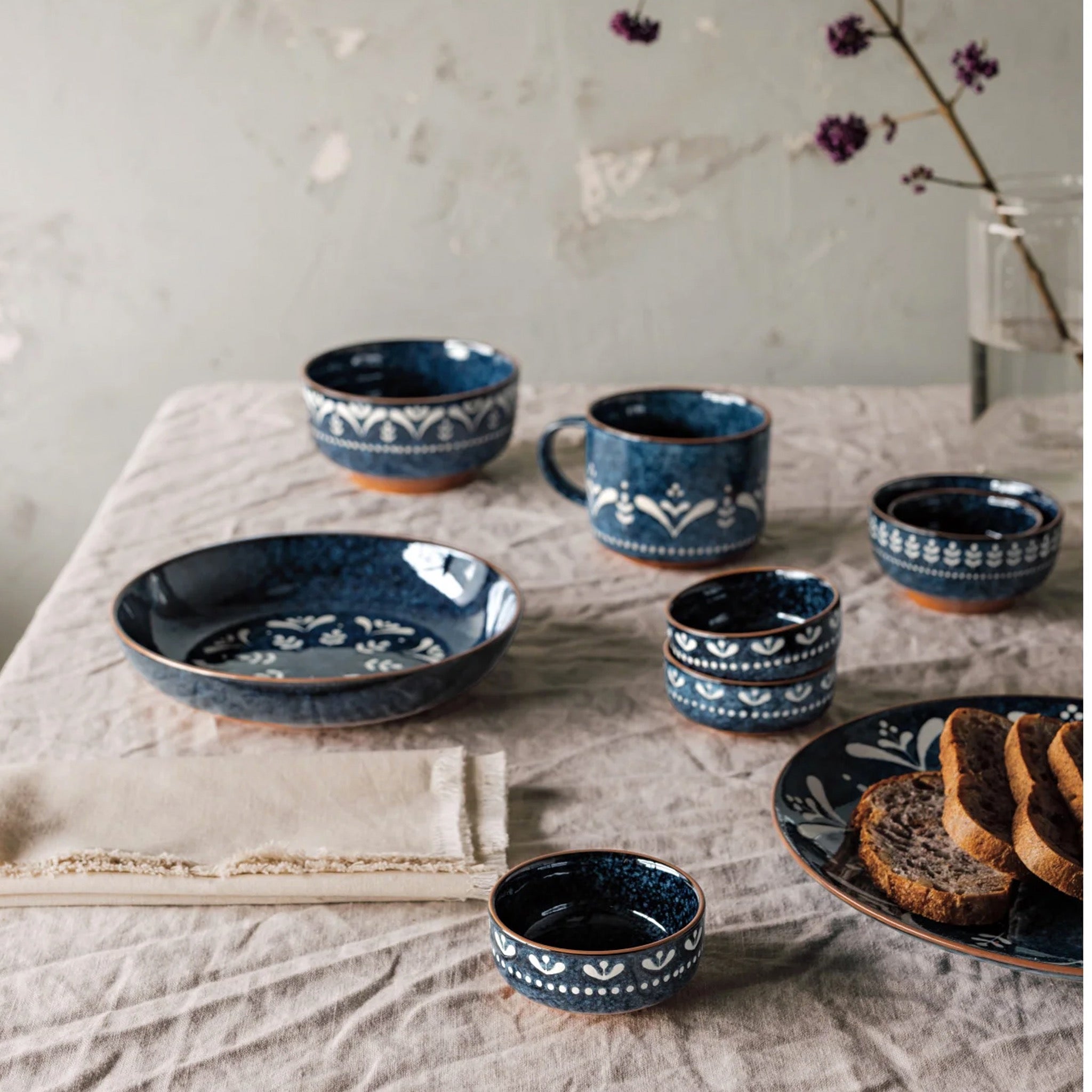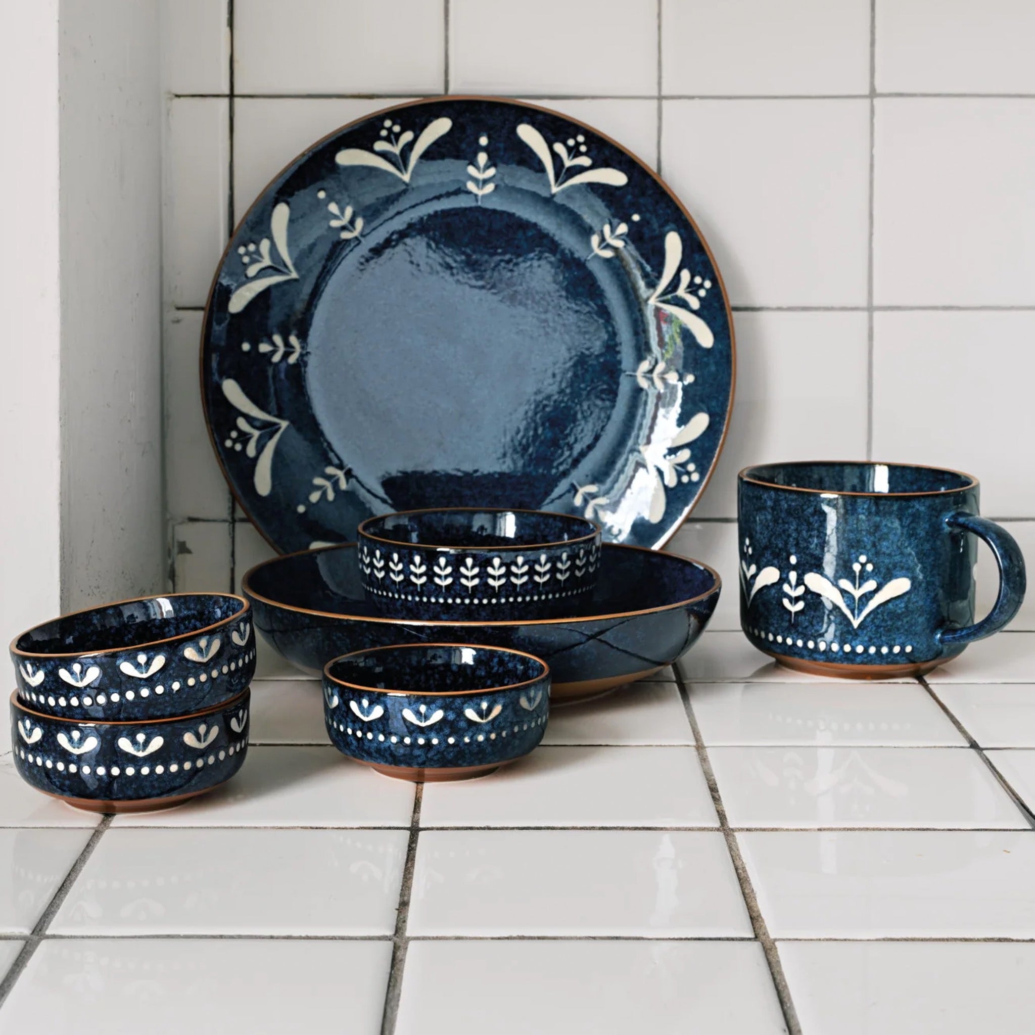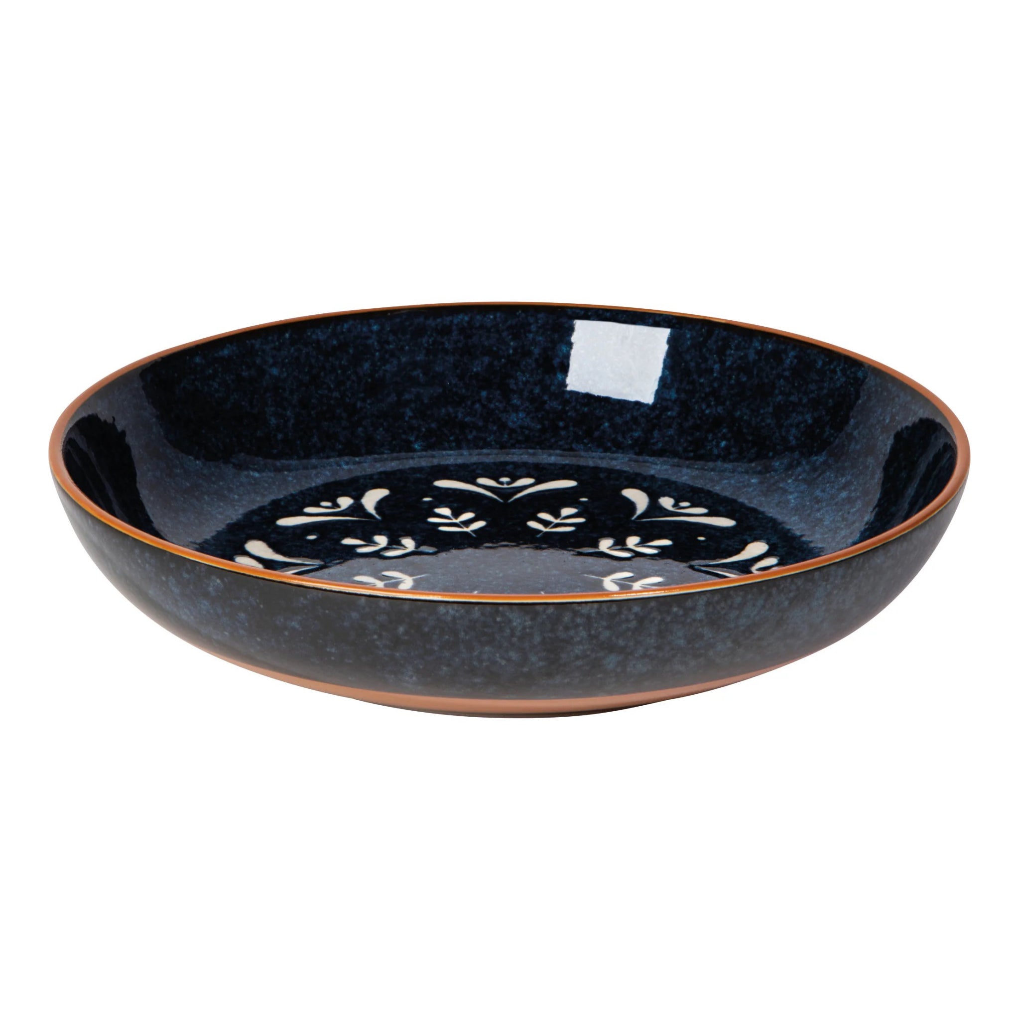 A deep night-sky blue with striking radial patterns, the Nightbloom serving bowl adds bold flair to classic ceramic serveware.