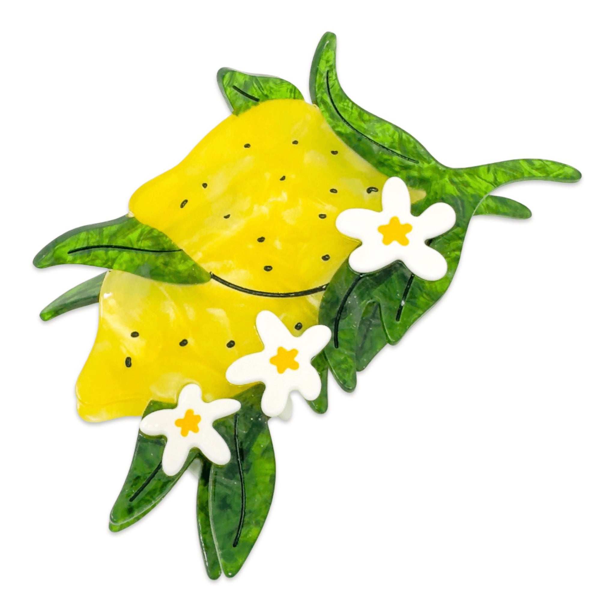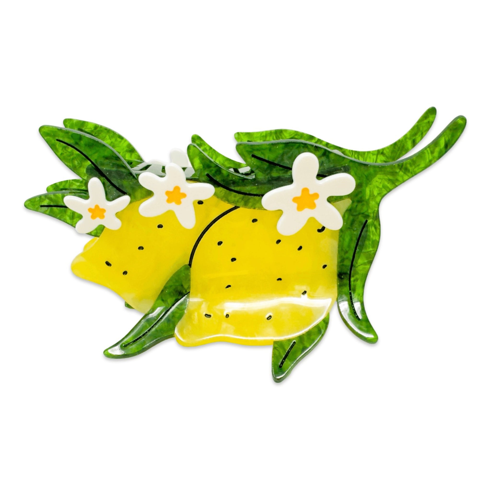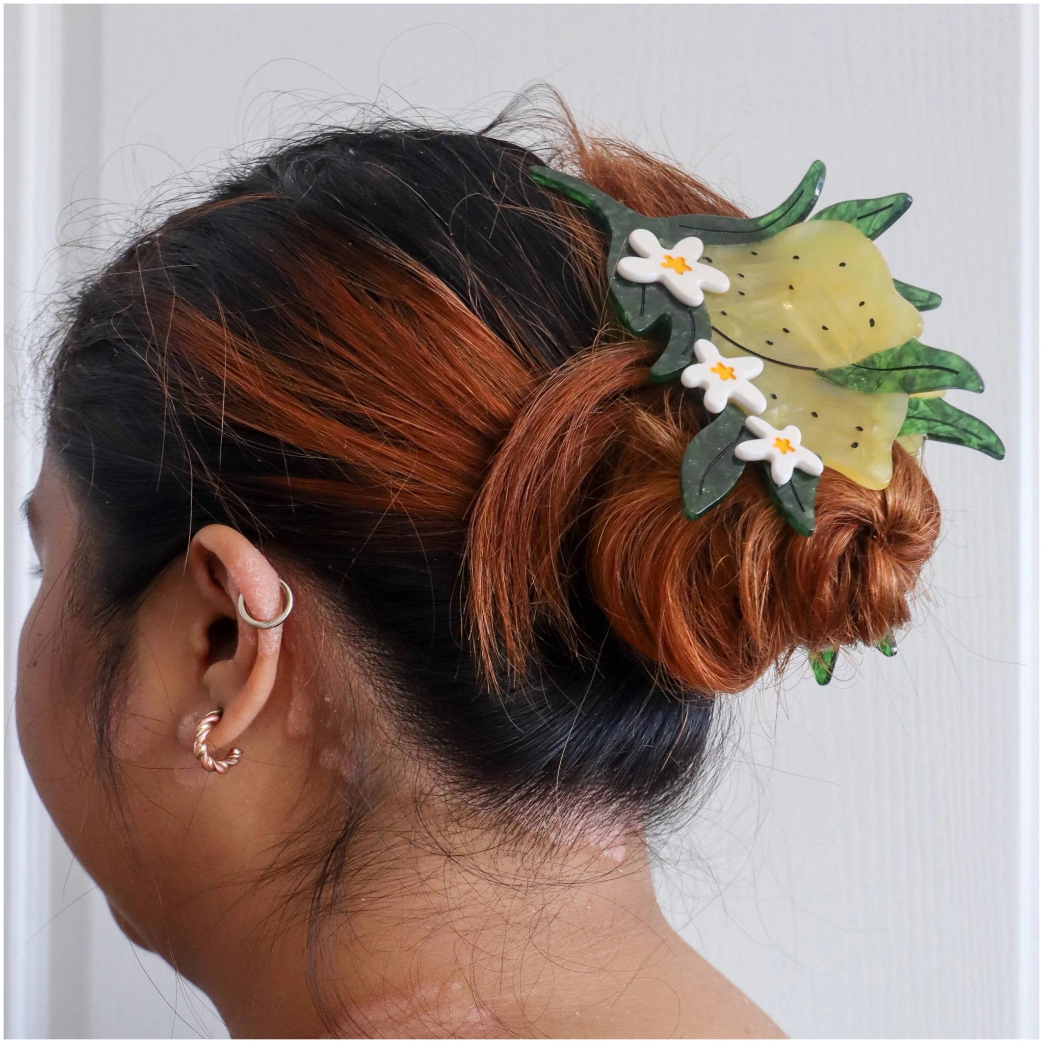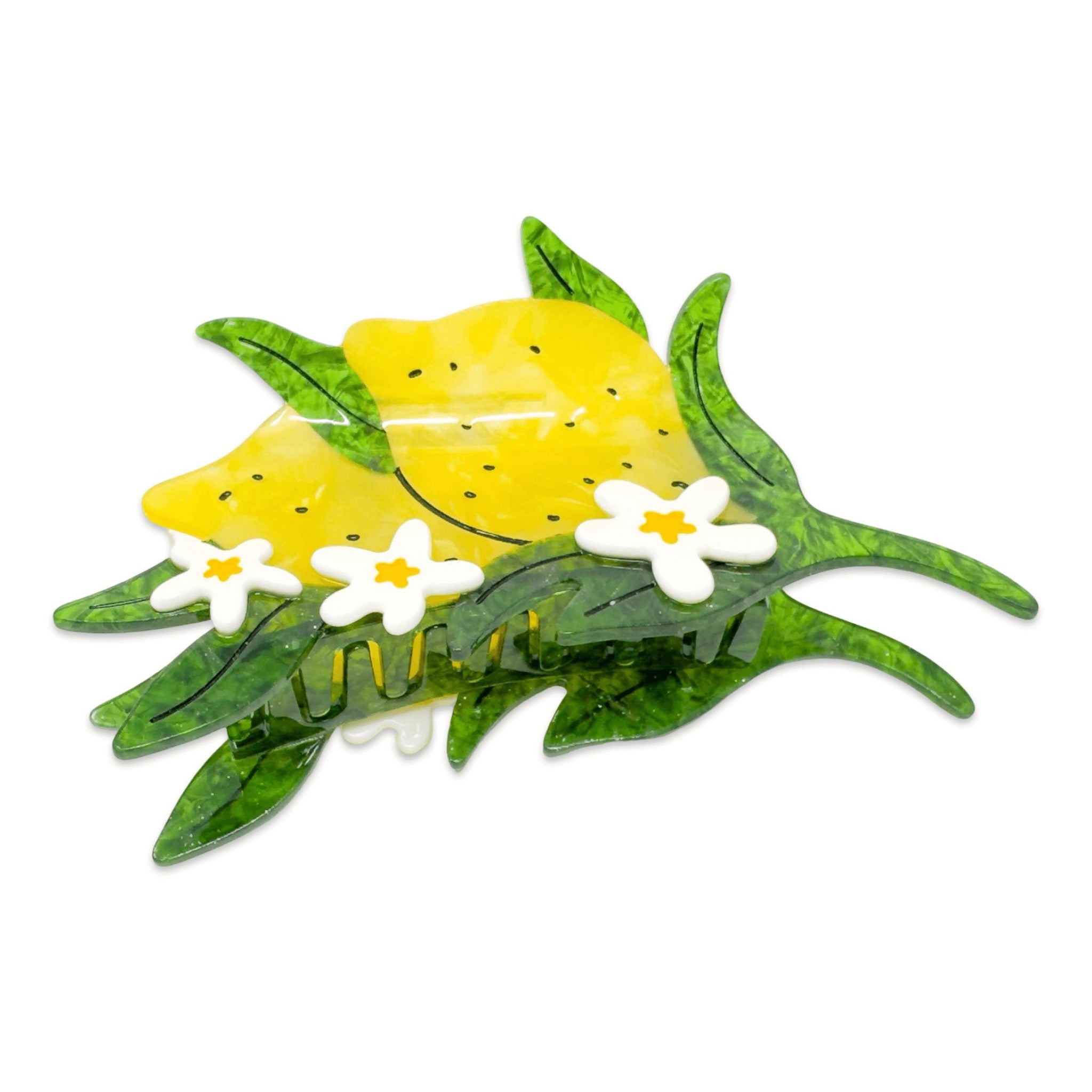 Bring major sunshine to any hairstyle with this XL lemon and flowers hair claw. With leafy details, bright blossoms, and citrus charm, it’s a bold clip that instantly perks up a bun or twist.