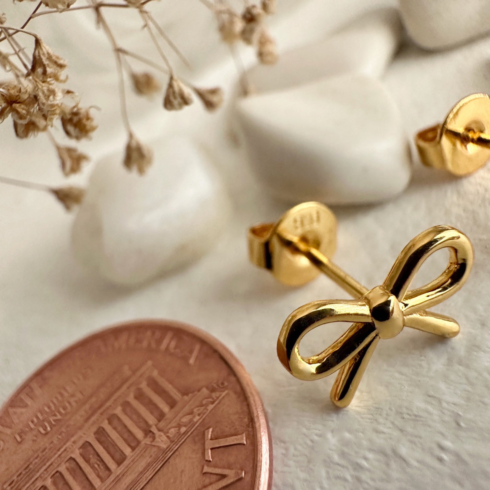 These gold bow stud earrings are a sweet and stylish accessory. Perfect for everyday wear or dressed-up looks, they bring a playful touch to any outfit.