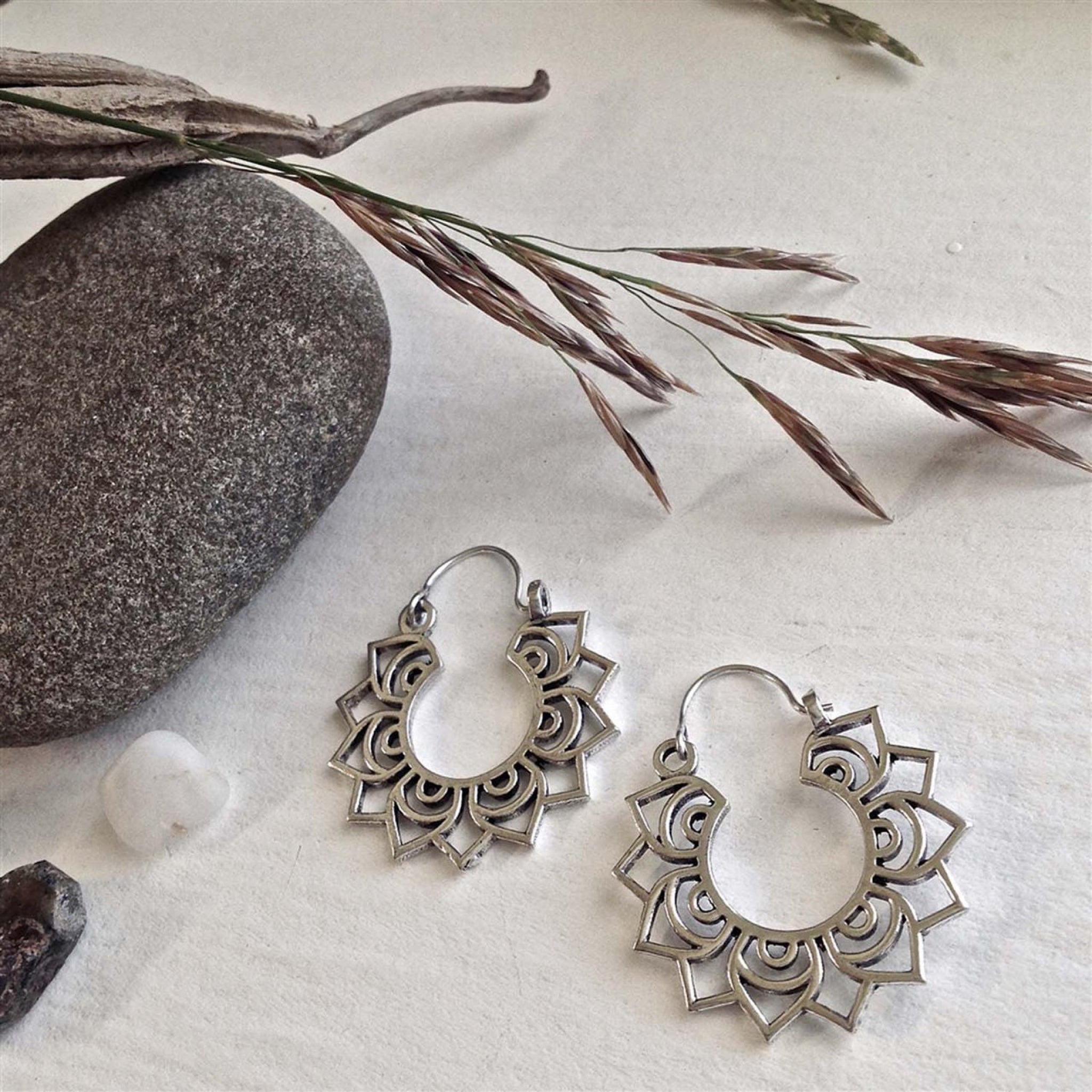 Find your flow with these silver lotus mandala earrings, featuring detailed floral hoop designs that bring a touch of boho charm to any style.