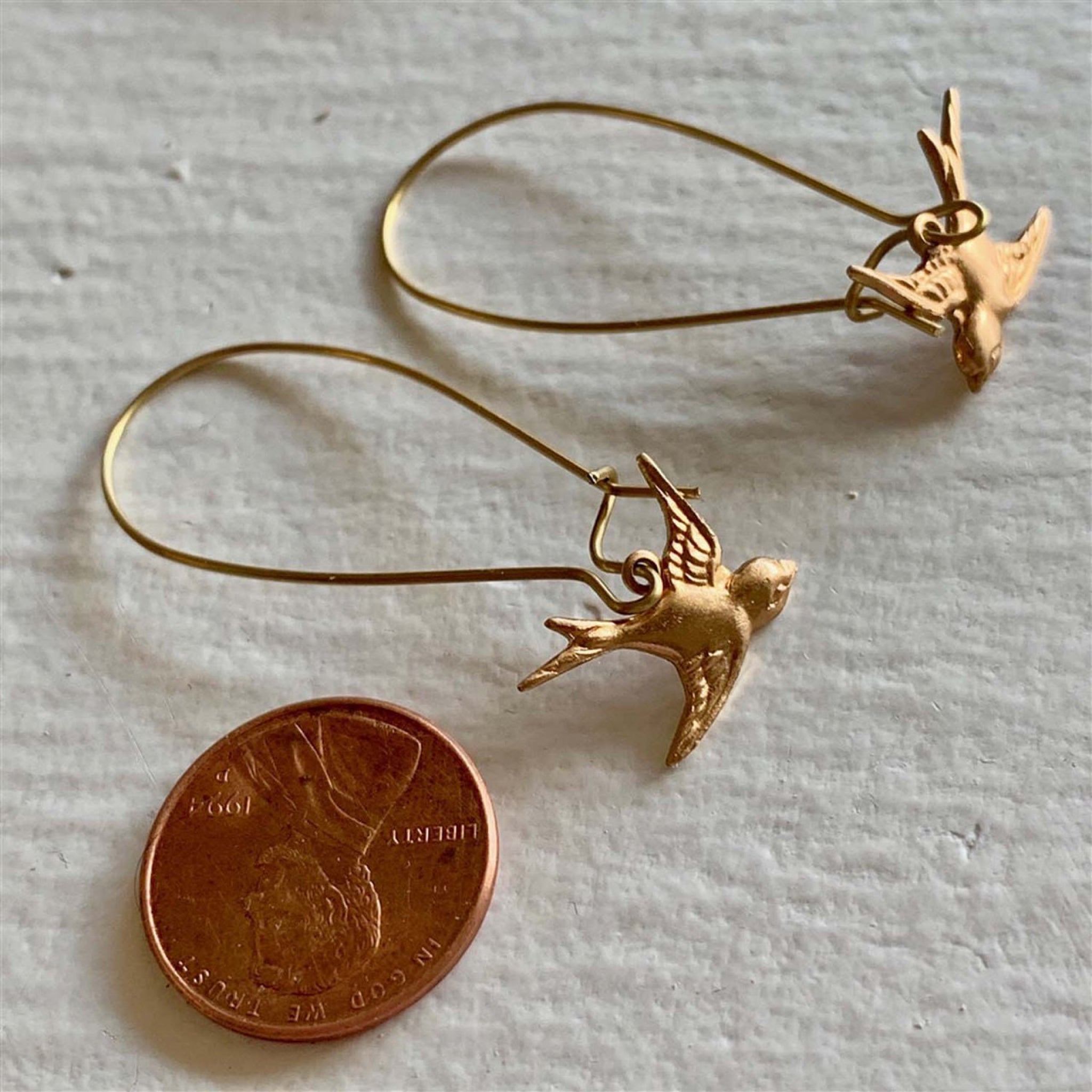 These brass drop earrings feature mirrored sparrow charms that bring a touch of whimsy and charm. Designed with shiny red brass kidney wires, they add a playful yet stylish detail to any outfit.