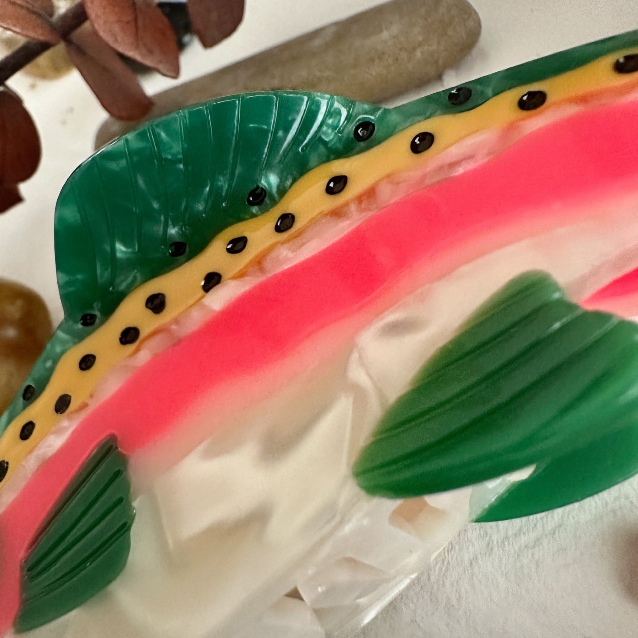 Trout fish hair claw with bold rainbow colours, a fun and quirky accessory that adds a splash of personality to any hairstyle.