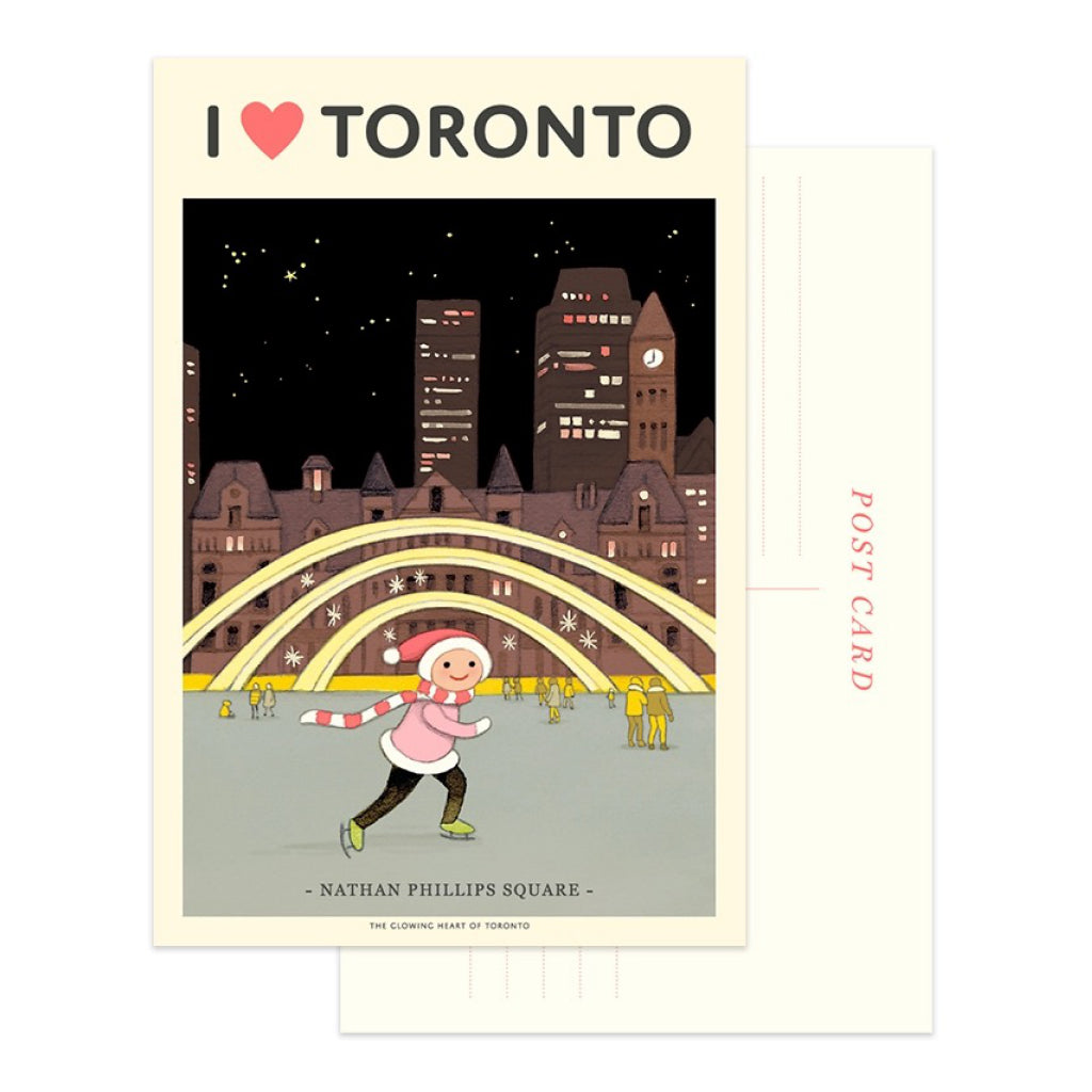 This postcard captures the magic of Nathan Phillips Square with a cozy, night time Toronto scene full of glow and city charm. Printed with bright neon ink details on thick FSC certified cover stock, it is perfect for sending a little love from the city.