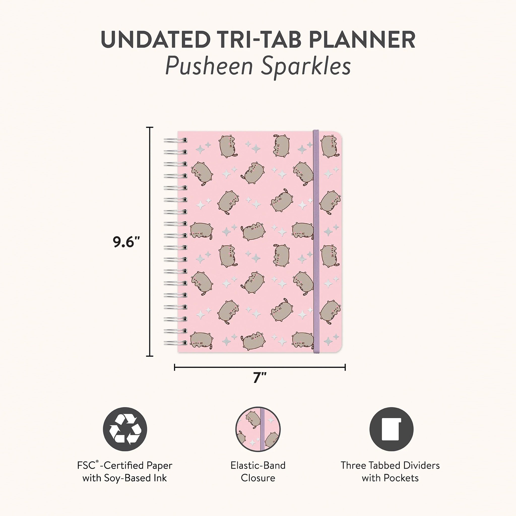 The Pusheen Sparkles undated tri tab planner makes organizing fun and flexible. With monthly and weekly spreads, notes pages, and Pusheen artwork on every page, it’s perfect for staying motivated all year.