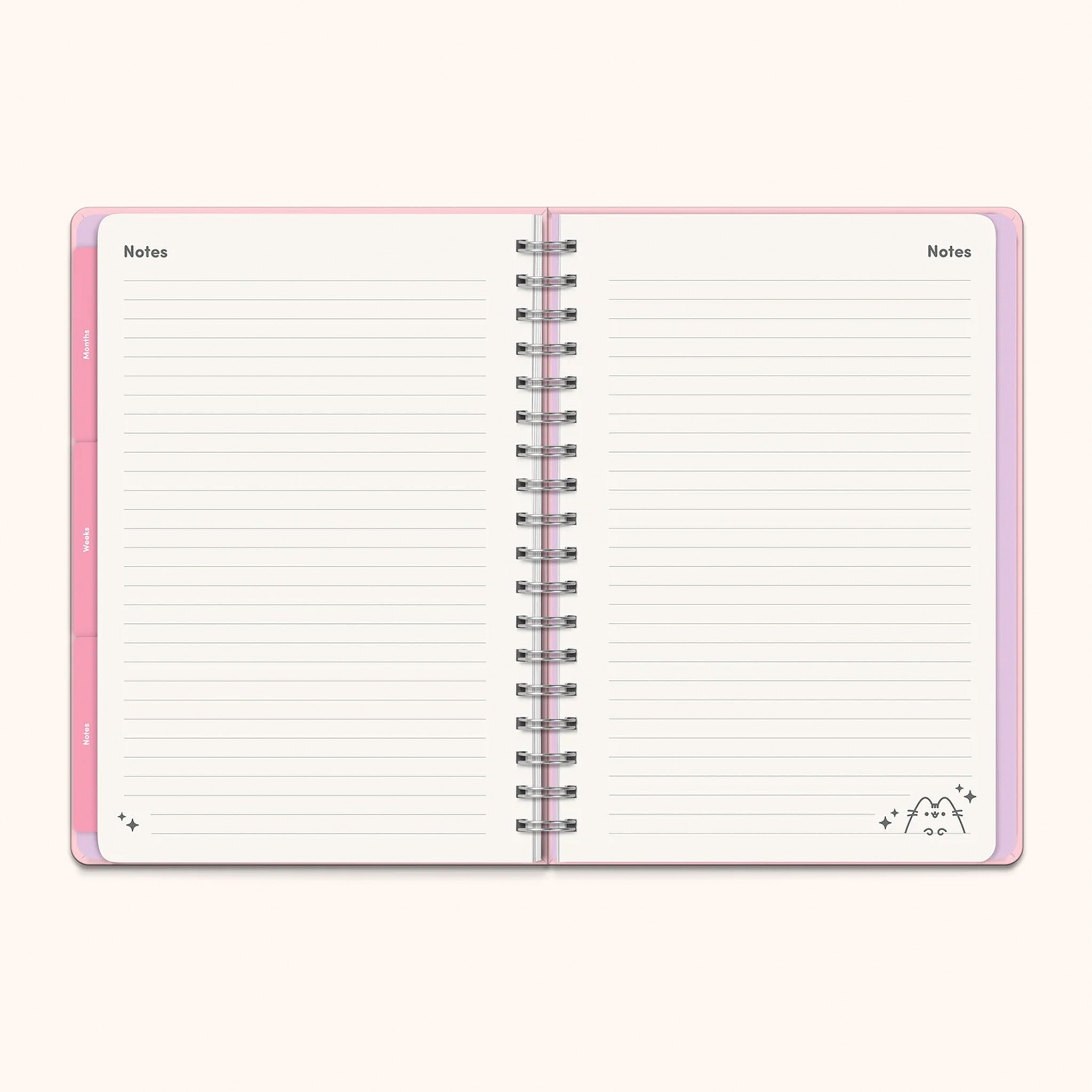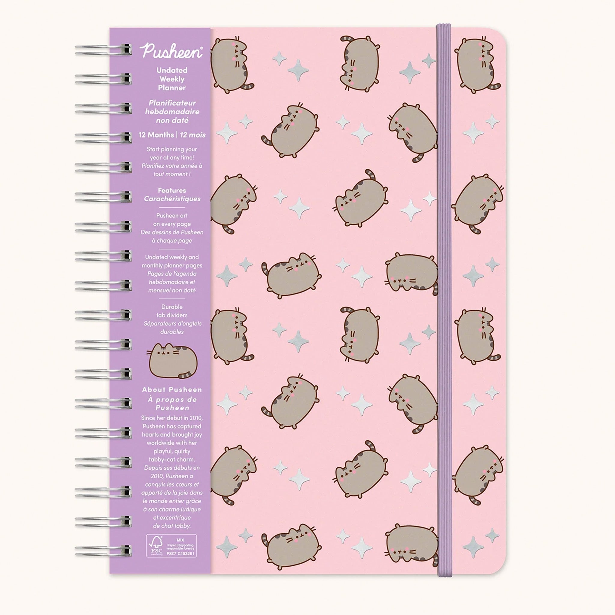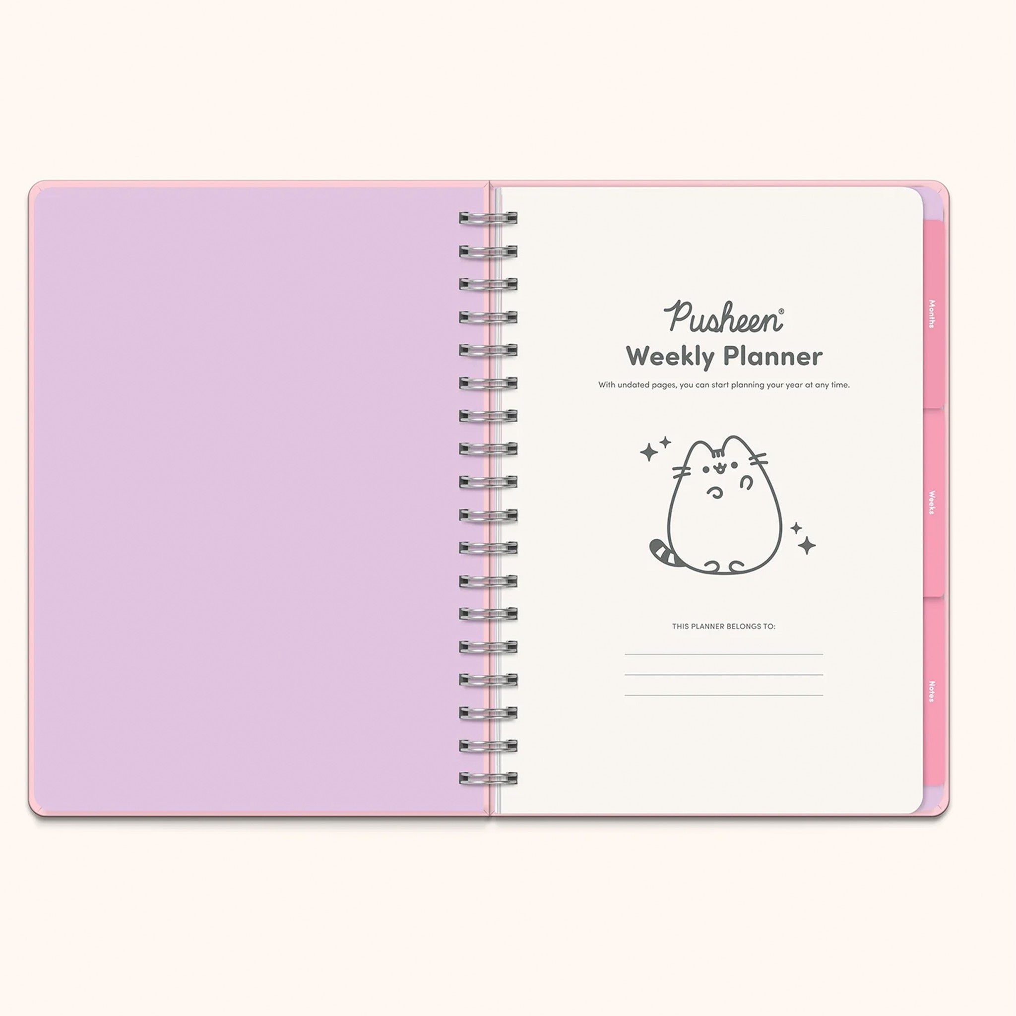 Designed with tabbed dividers, storage pockets, and a flat lay wire o binding, this planner keeps your goals, priorities, and plans in order with a dash of Pusheen charm.