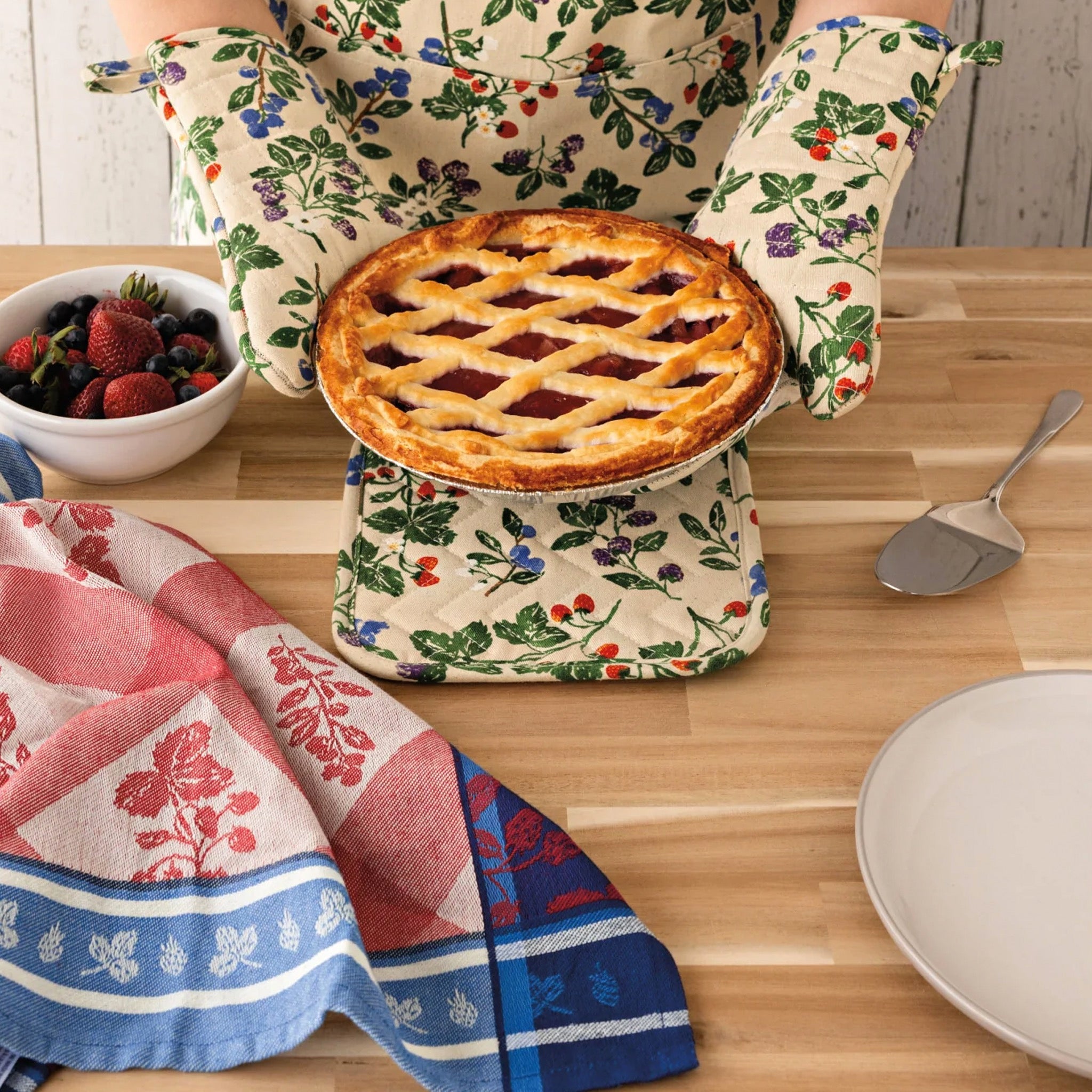 This Berry Bramble oven mitt adds cozy seasonal charm to everyday cooking with a quilted design that helps protect hands from heat. Lush fruit and bramble artwork brings a playful touch inspired by kitchen craft and outdoor foraging.