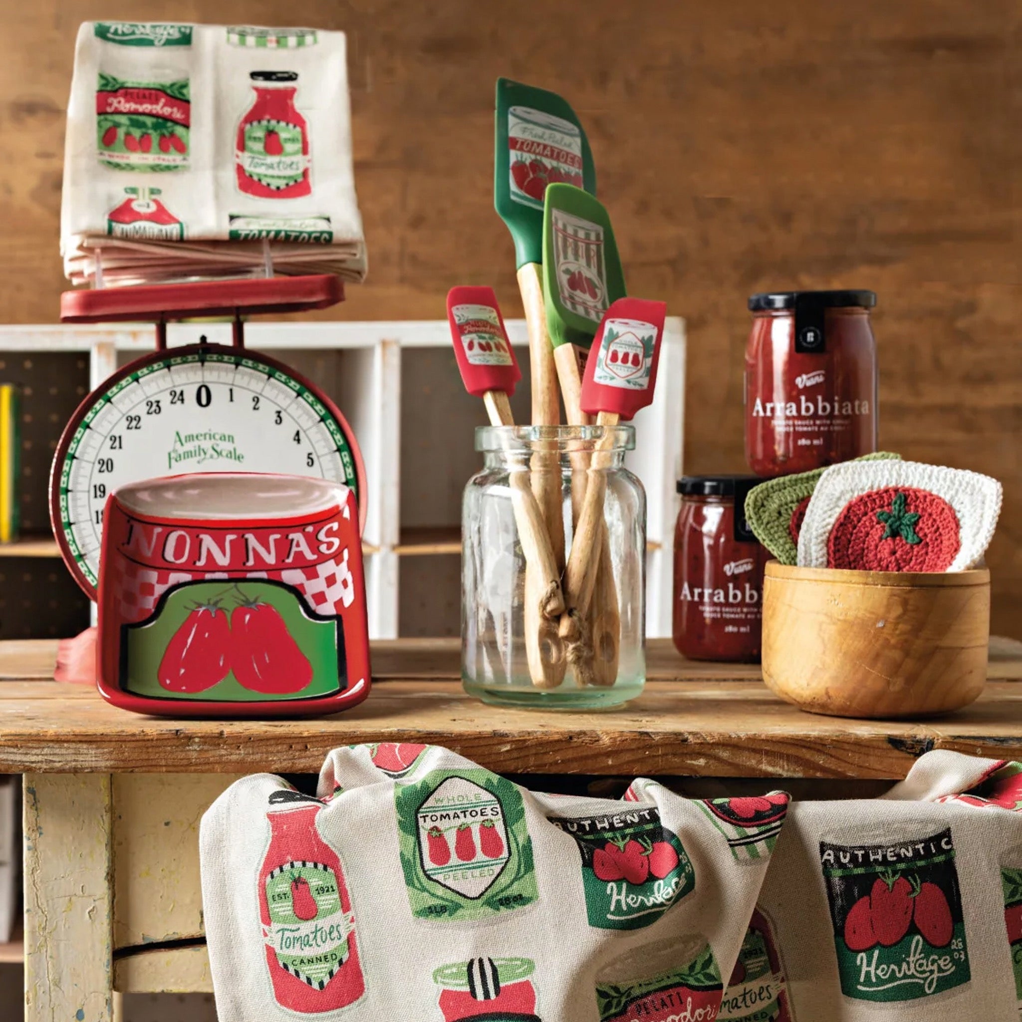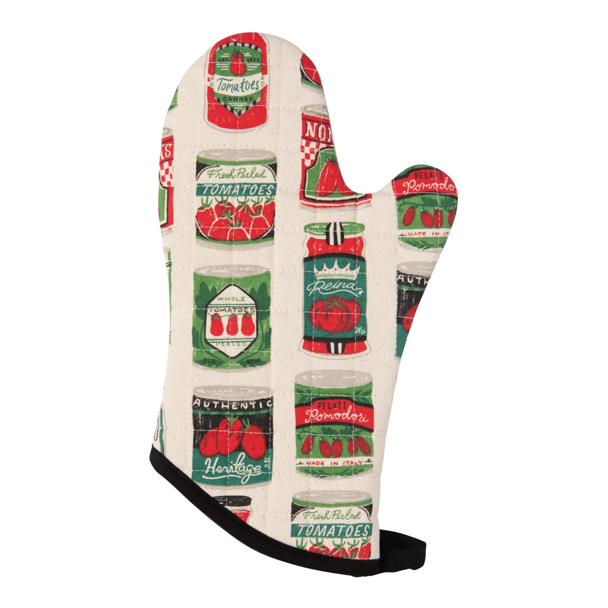 This Pomodori oven mitt adds vintage market charm to everyday cooking with a quilted design that helps protect hands from heat. Hand drawn tomatoes, rustic labels, and classic red and green patterns bring playful gourmet style inspired by old world kitchens.