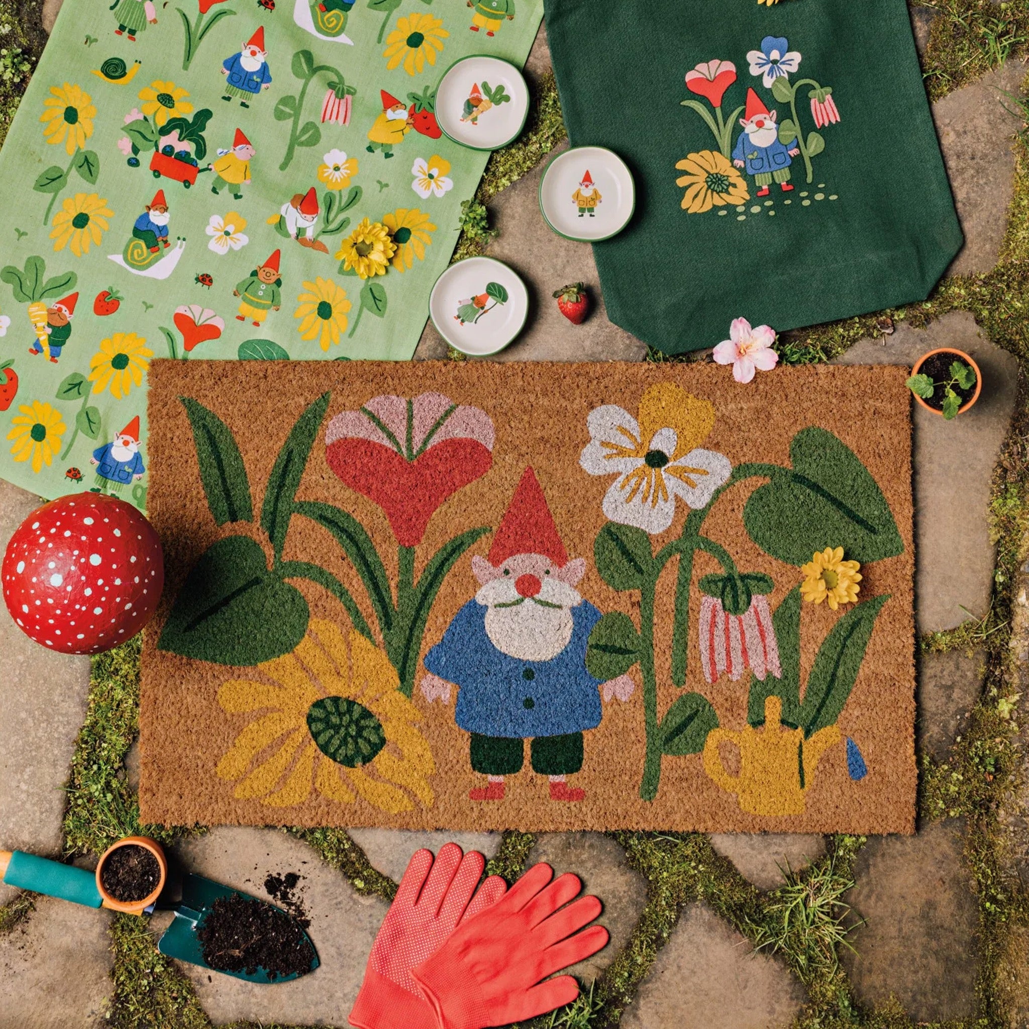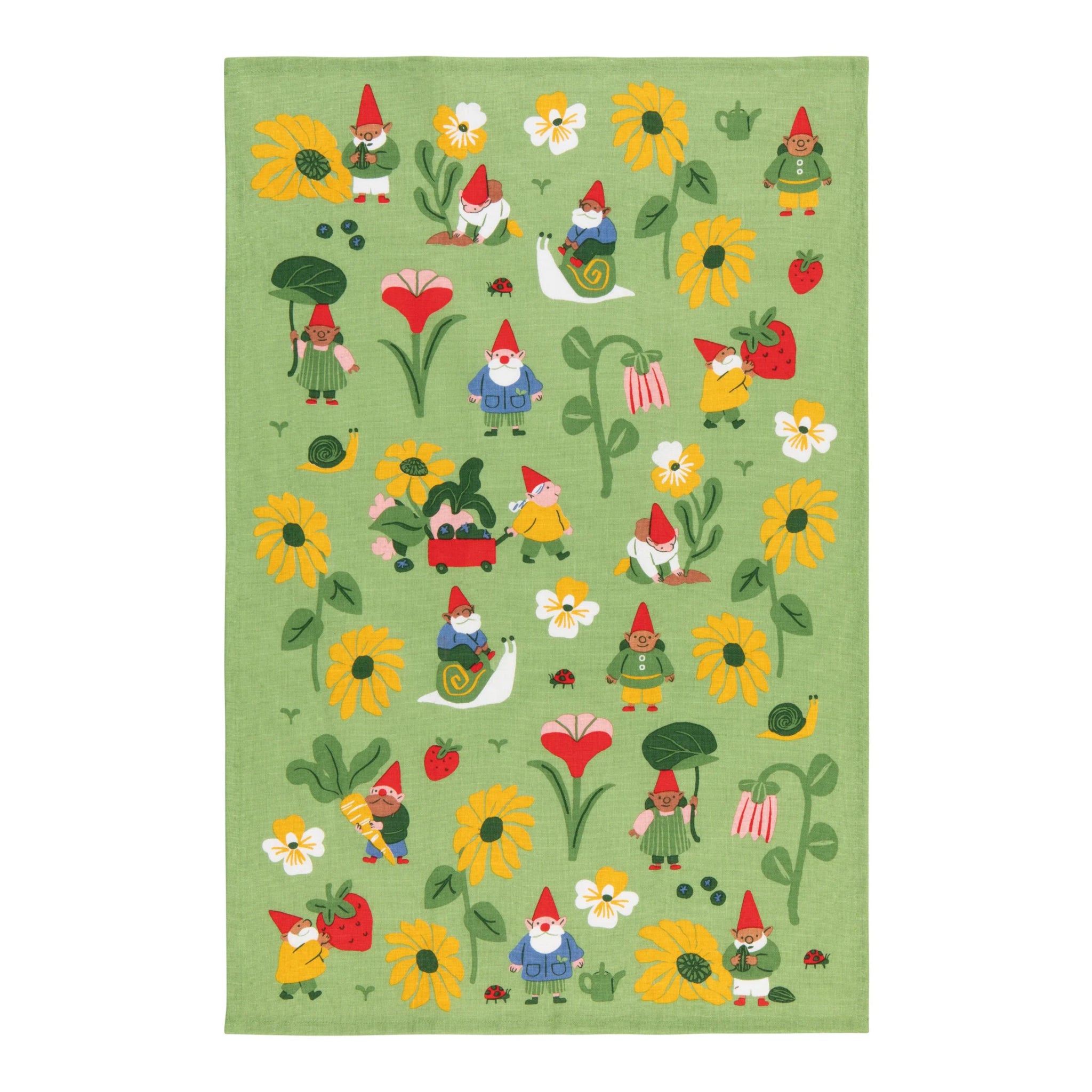 This Gnome Grown dishtowel adds playful storybook charm to everyday kitchen tasks. Red capped gnomes, busy snails, and bright blooms bring cheerful garden style to washing up.