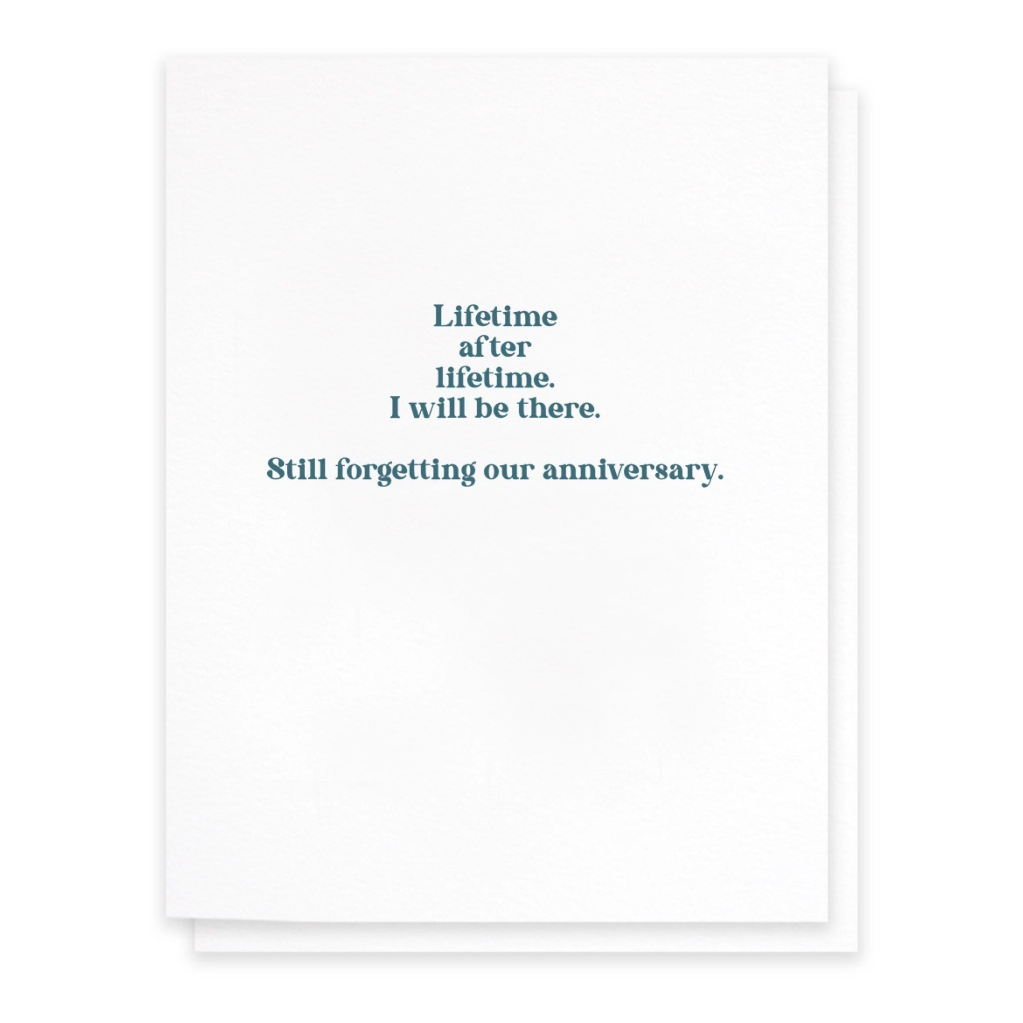 A sweet and funny anniversary card for the partner who will be there forever, even if the date still gets forgotten. Blank inside for your own message.