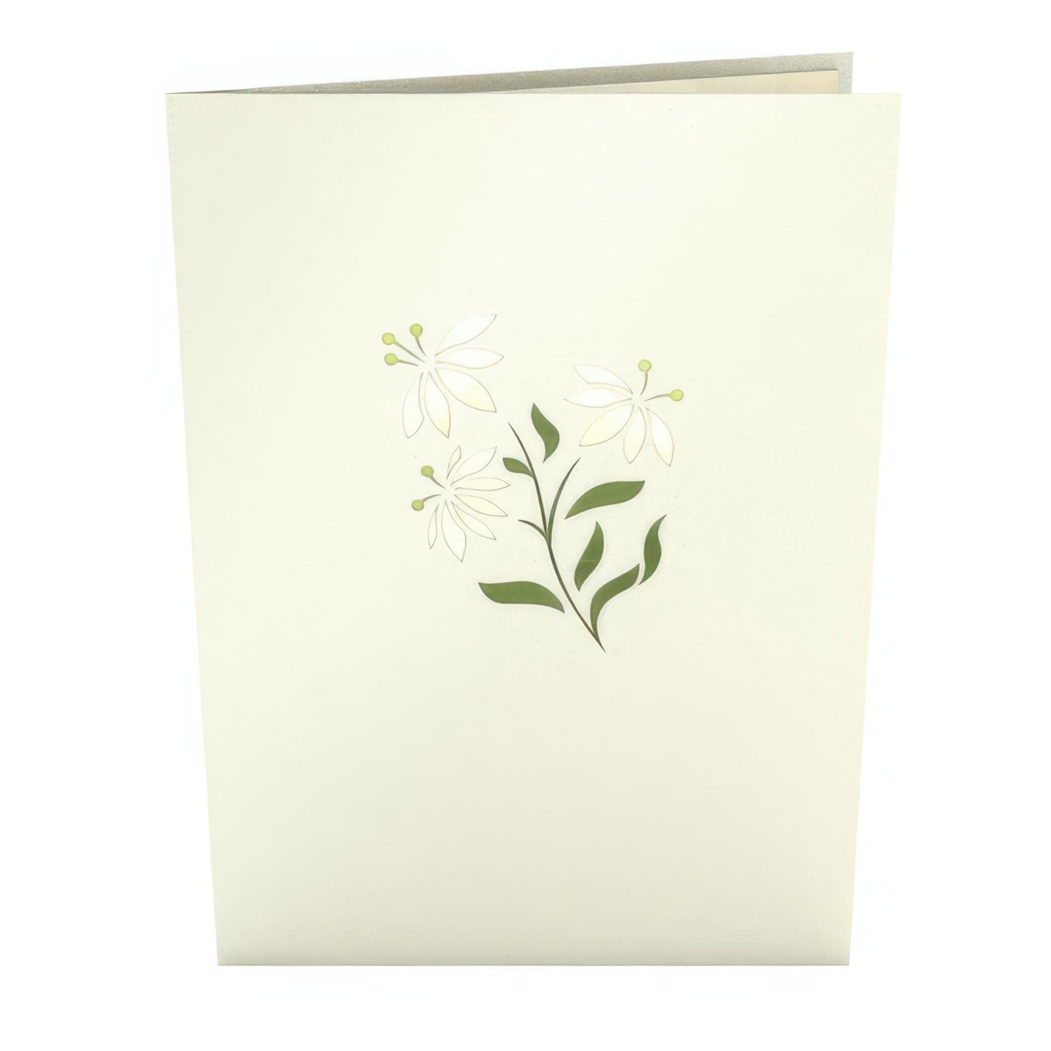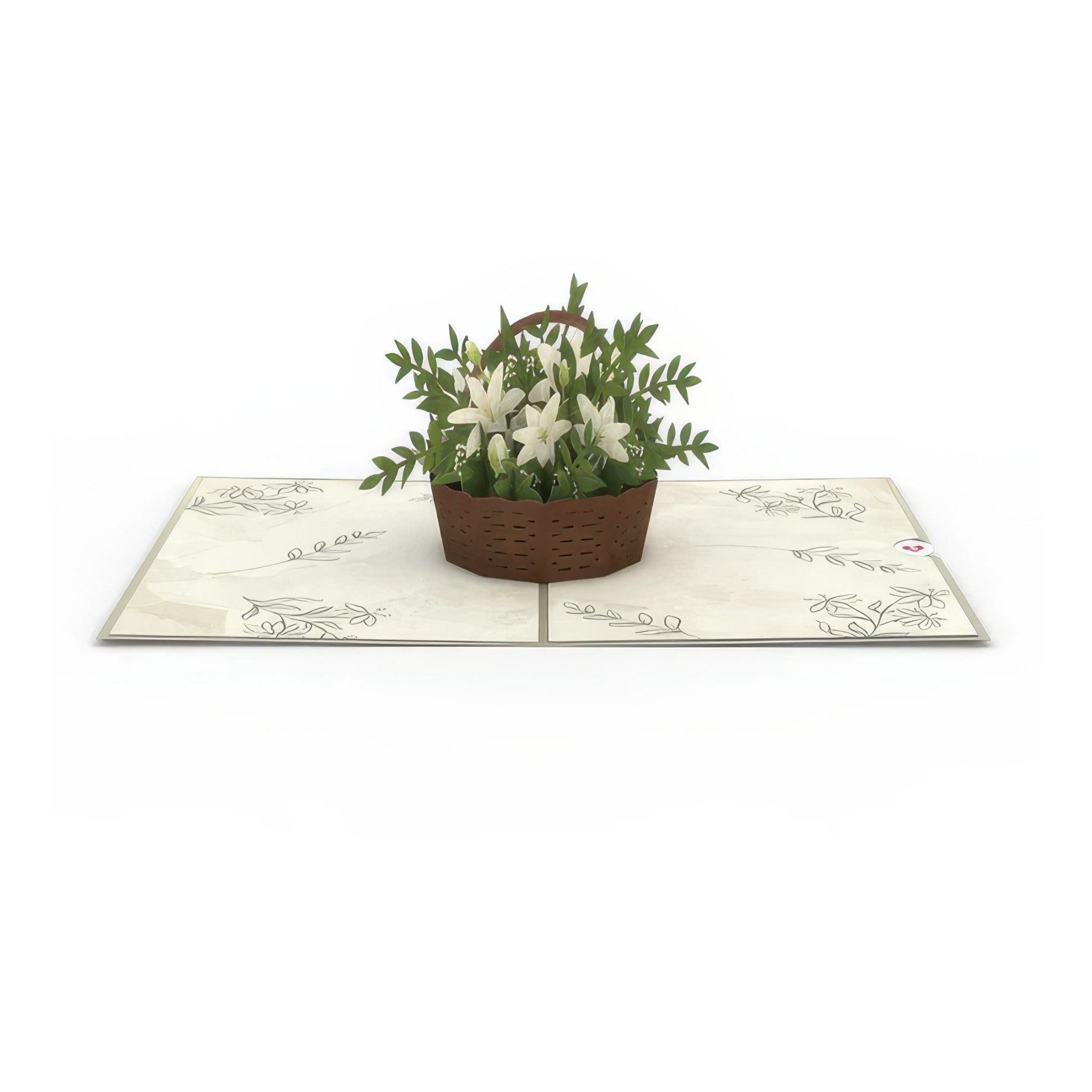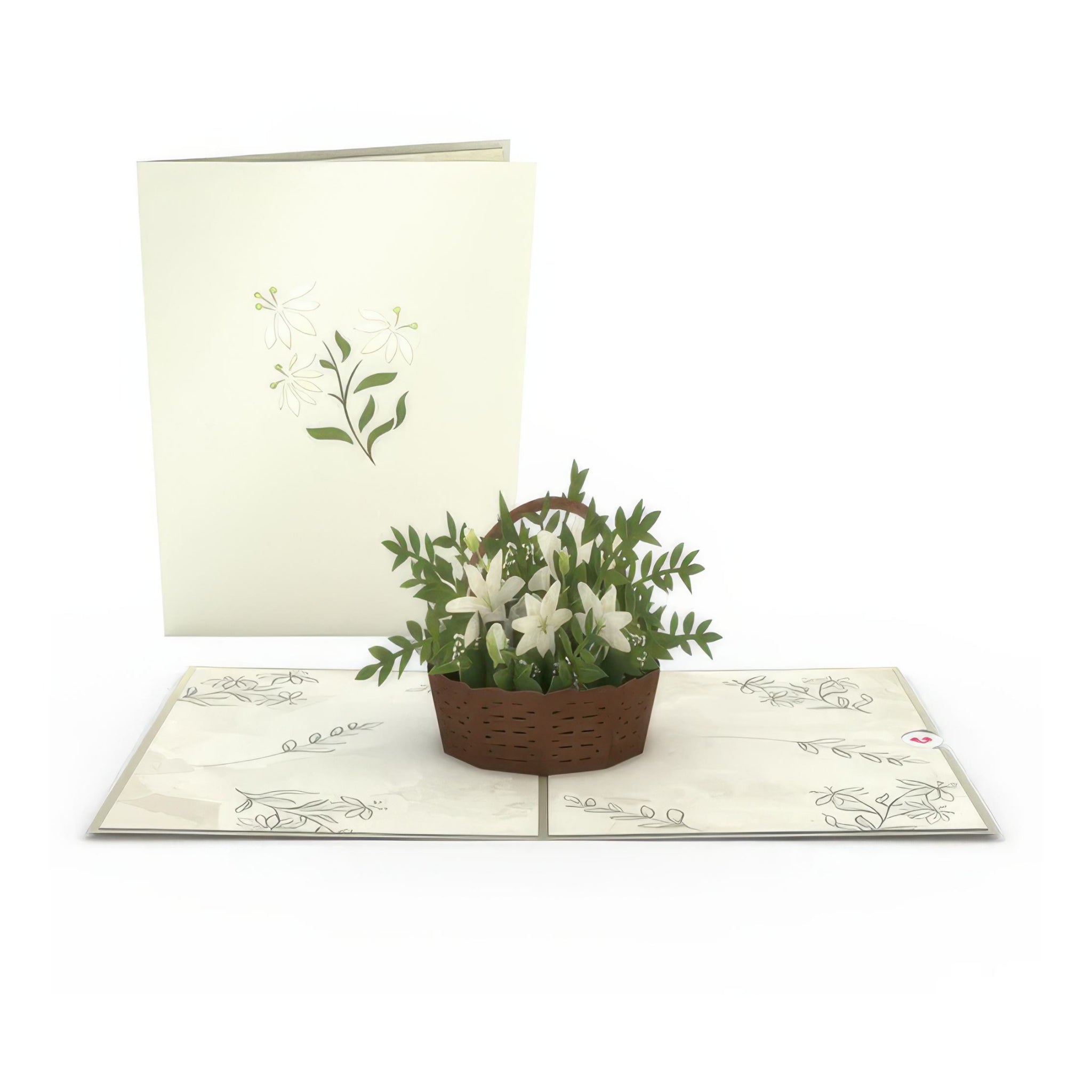 This pop-up card opens into a sweet 3D wicker basket filled with white lilies and lush green leaves. Elegant, bright, and full of springtime charm, it’s a paper bouquet that never wilts.