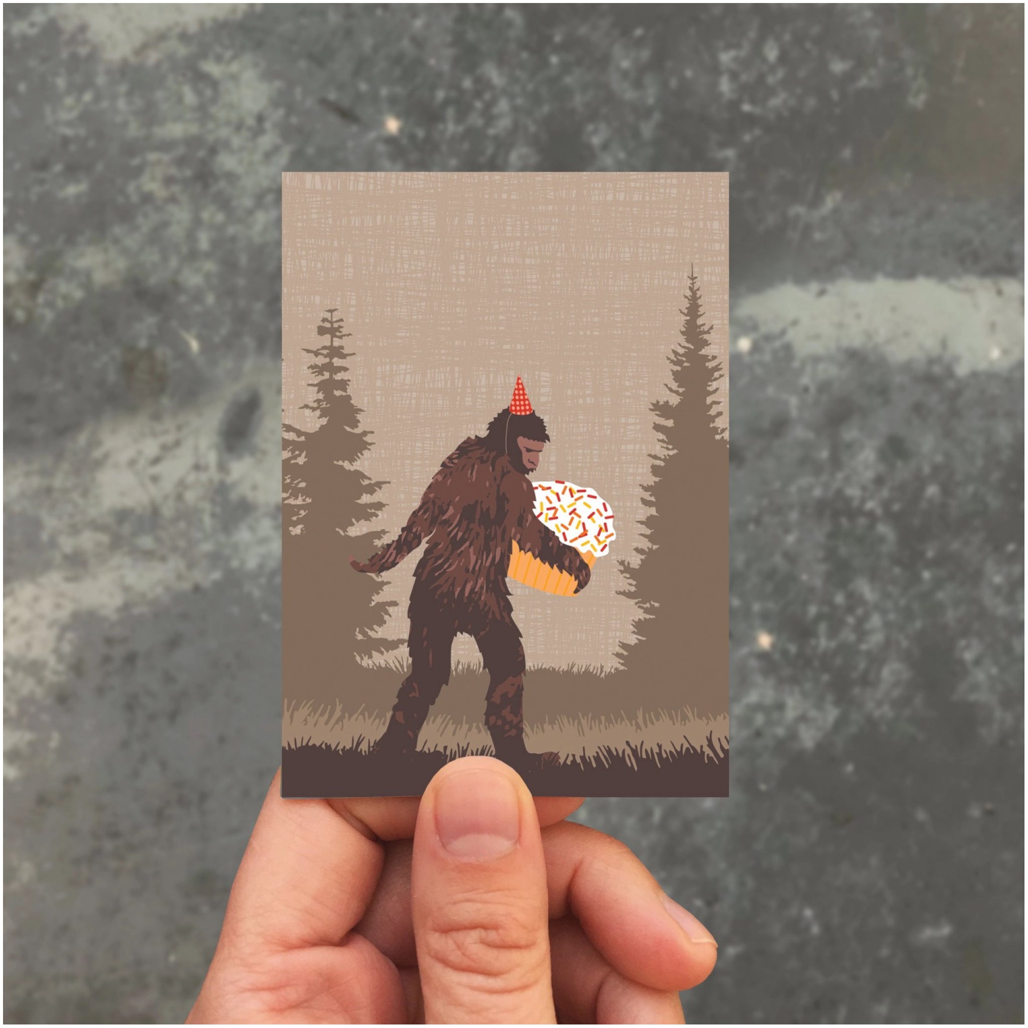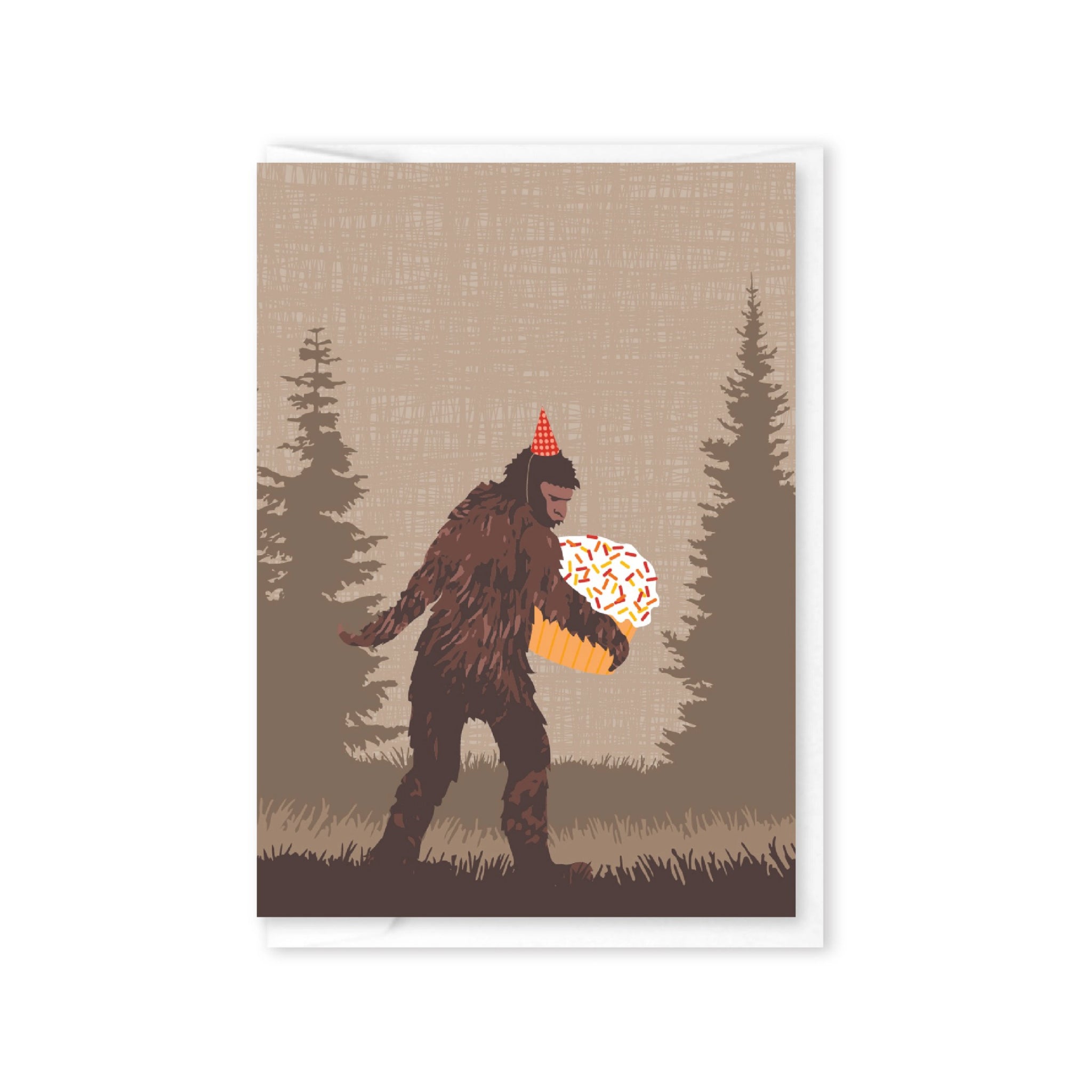 A mini enclosure card featuring a cupcake carrying sasquatch in a party hat, perfect for birthdays, gift add ons, and tiny notes with big charm.