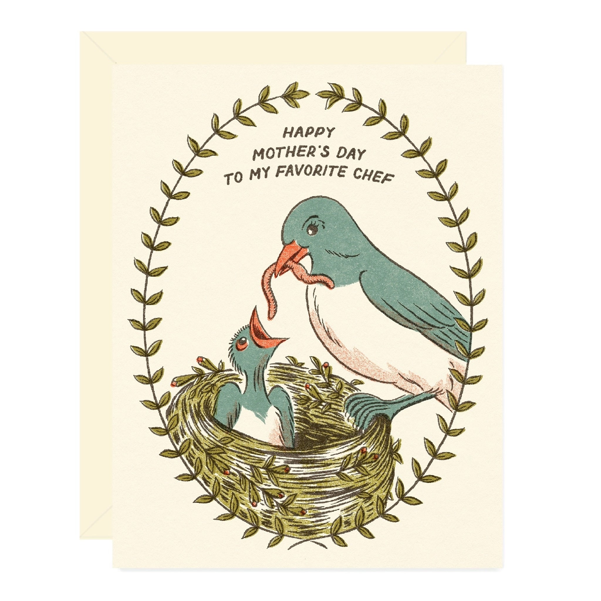 A playful Mother’s Day card with a bird and worm joke for favorite chefs.