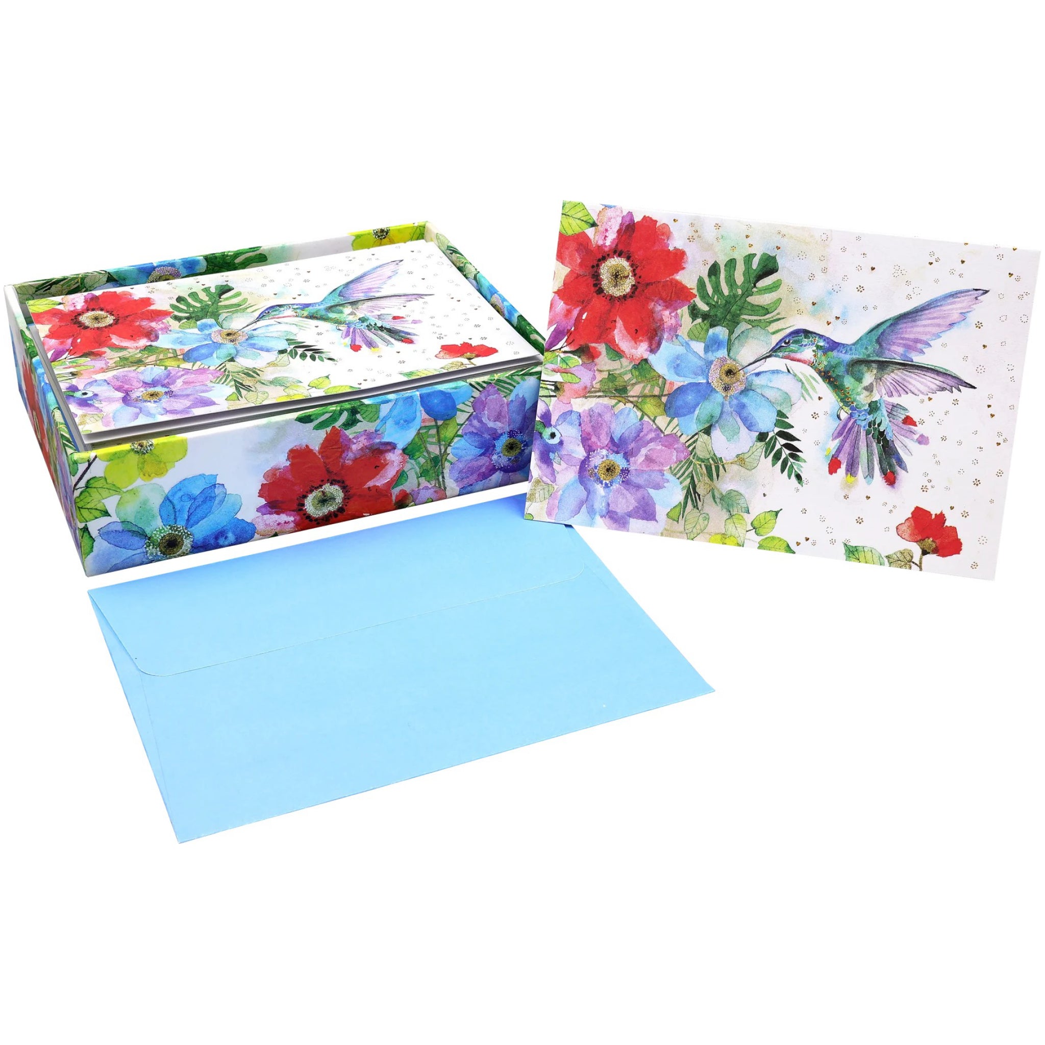 Charming note cards feature a colourful hummingbird surrounded by vibrant garden blooms, perfect for any handwritten message.