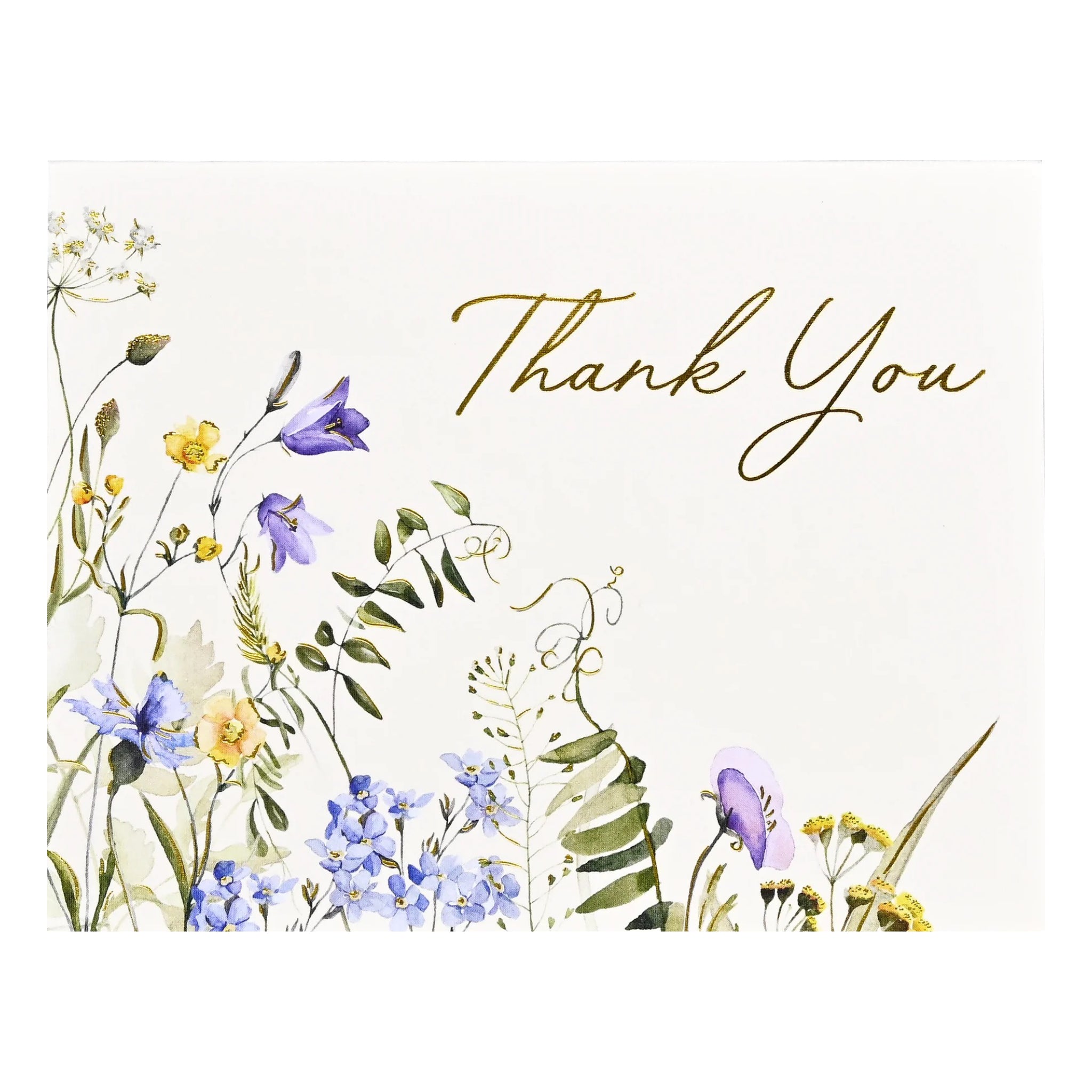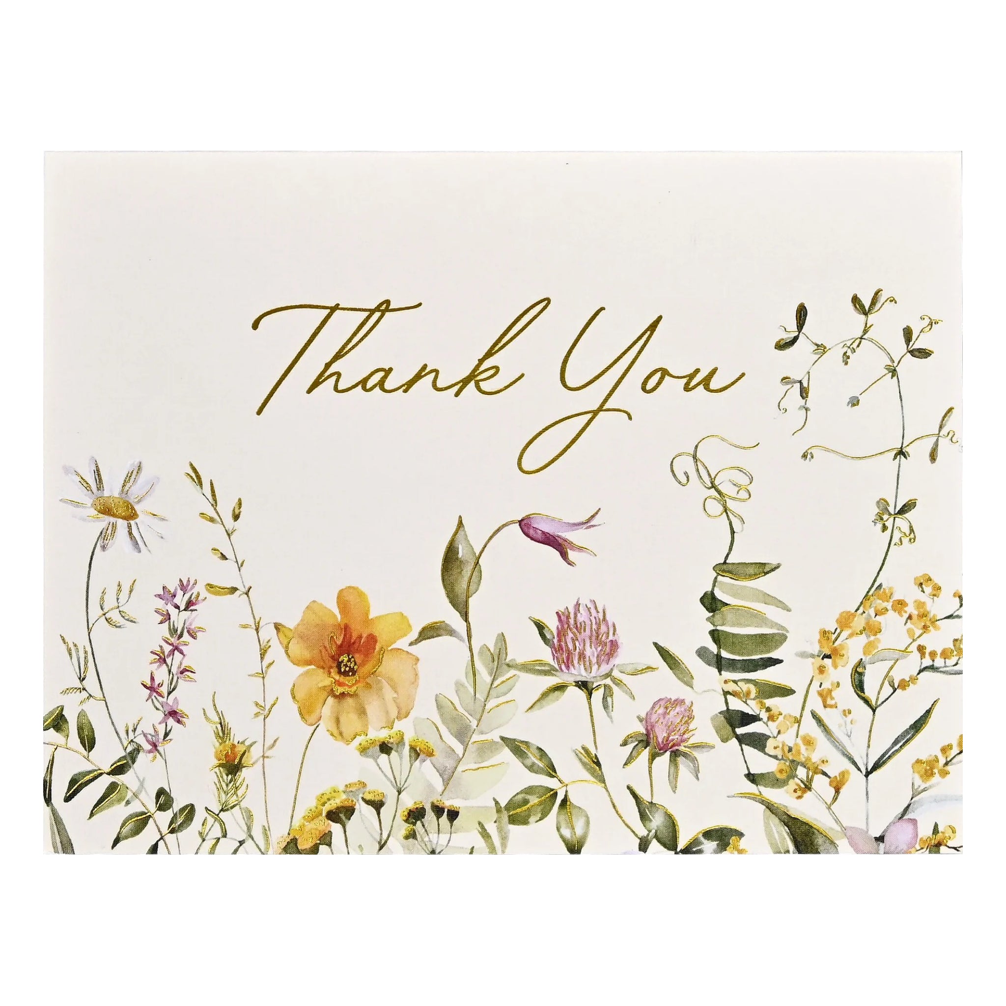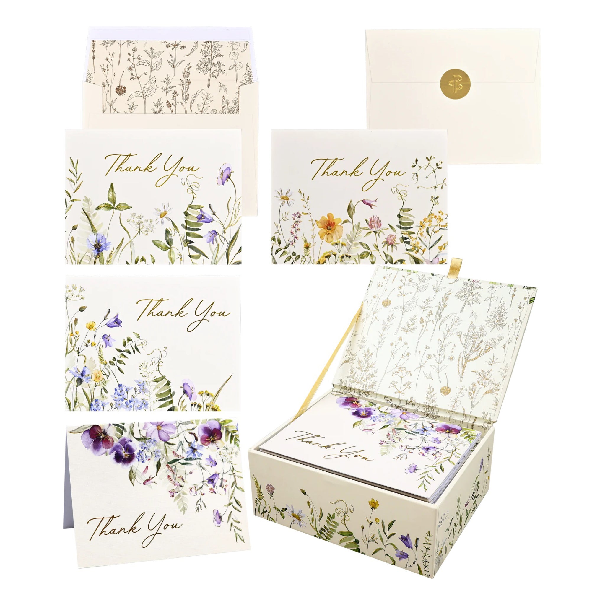 A beautiful thank you card set featuring wildflower designs, gold foil stickers, and lined envelopes in an elegant keepsake box.
