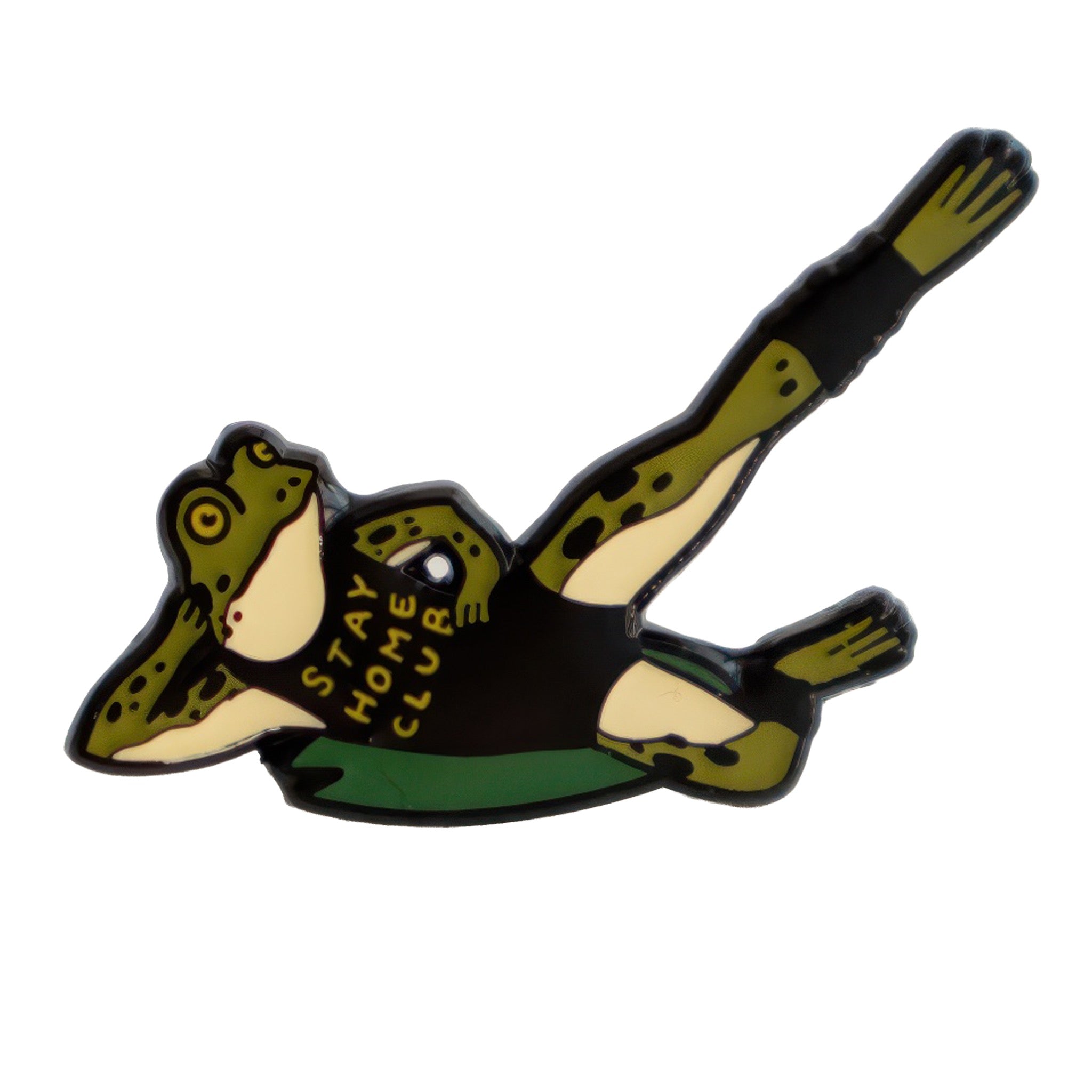 A hilarious enamel pin featuring a lounging workout frog that reads “Stay home club.” Perfect for jackets, bags, and low effort fitness vibes.