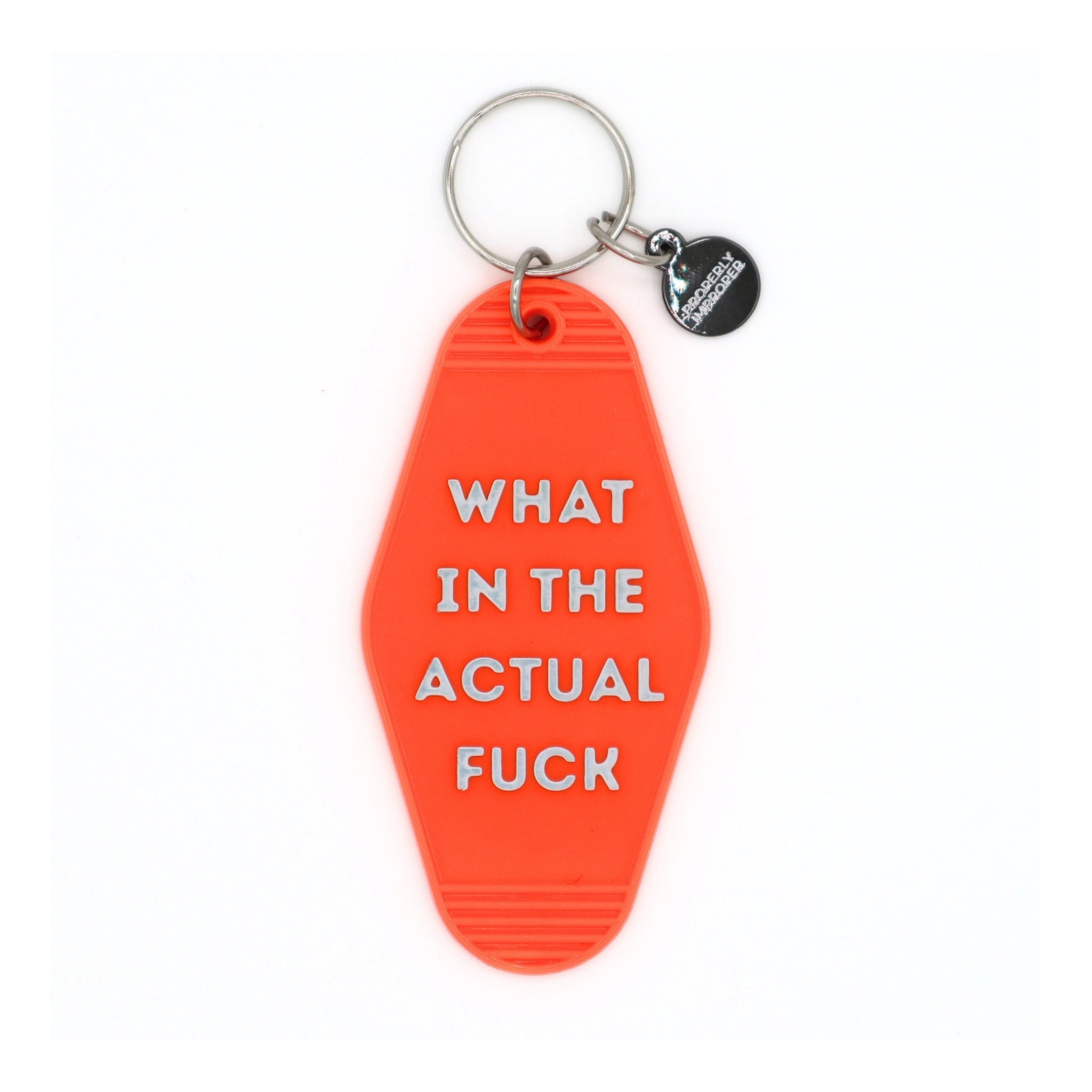 This motel keychain spells it out with “What in the actual fuck” in holographic hot stamp on both sides, plus a clear coating to help prevent scratches.