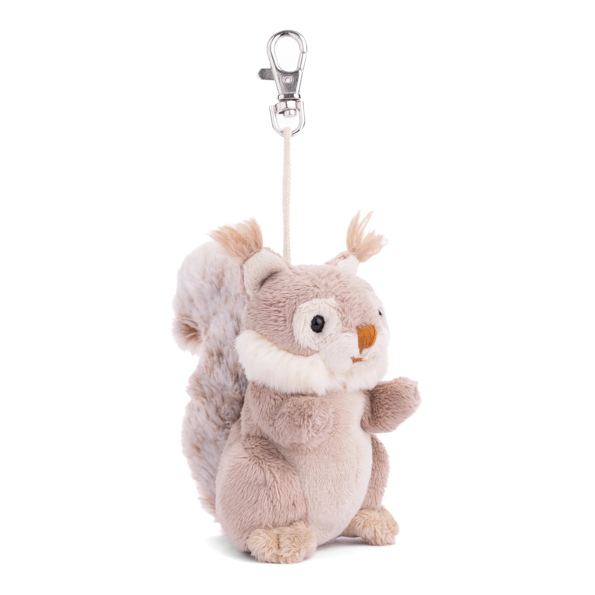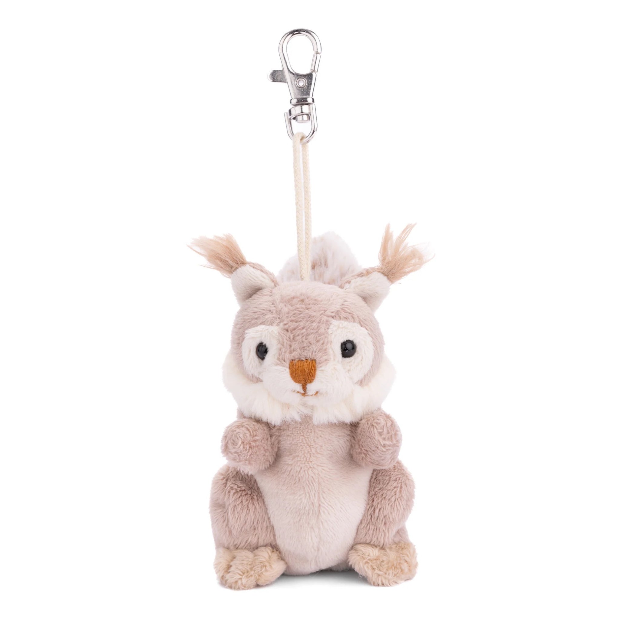 Meet Wiggles, a pocket sized squirrel with a soft neutral coat, fluffy swishy tail, and the sweetest little tufted ears. This plush bag charm clips easily to keys, backpacks, or purses, adding cozy woodland charm wherever it goes.