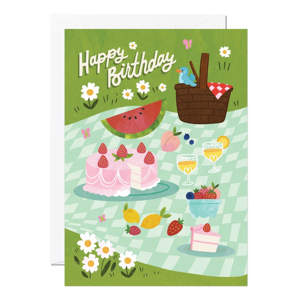 Cheerful birthday picnic card with cake, fruit, and florals, perfect for sending sweet and sunny birthday wishes full of charm.