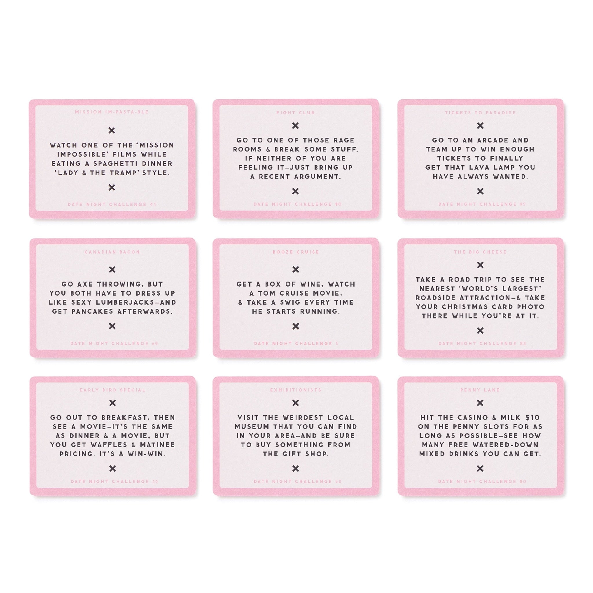 Date Night Challenges is a playful card set with 100 quirky prompts to spark romance, laughter, and adventure for couples looking to keep it fun.