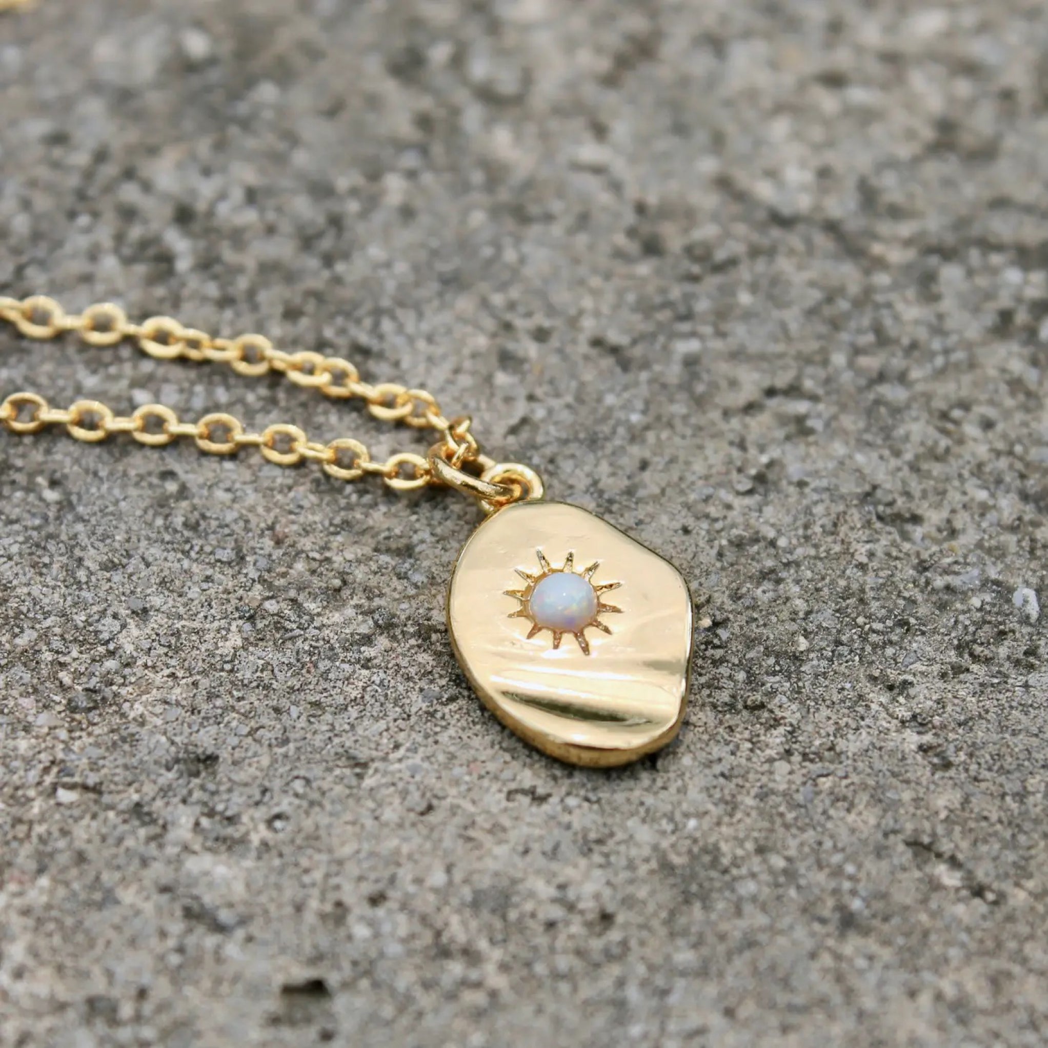 The Opal Disc Necklace features a 16K gold-plated brass pendant and chain. With a pendant height slightly over half an inch, this opal necklace seamlessly adds a splash of elegance to any outfit.