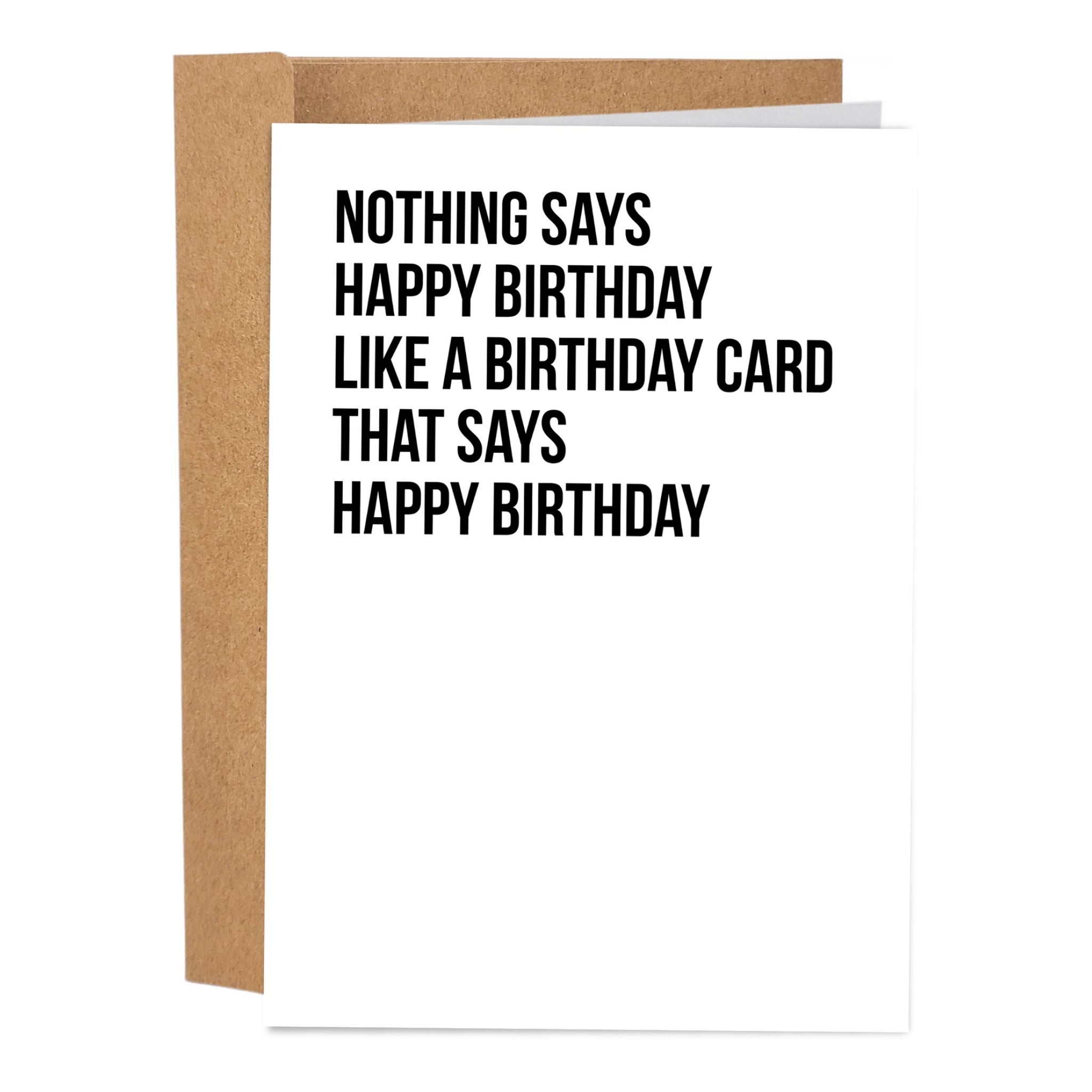 A delightfully literal birthday card that reads “Nothing says happy birthday like a birthday card that says happy birthday.” Blank inside for the message that really counts.