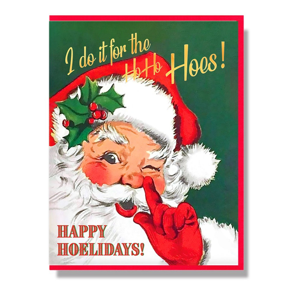 Cheeky, bold, and unapologetically funny, this holiday card brings vintage Santa art together with gold foil sparkle for a festive message packed with attitude.