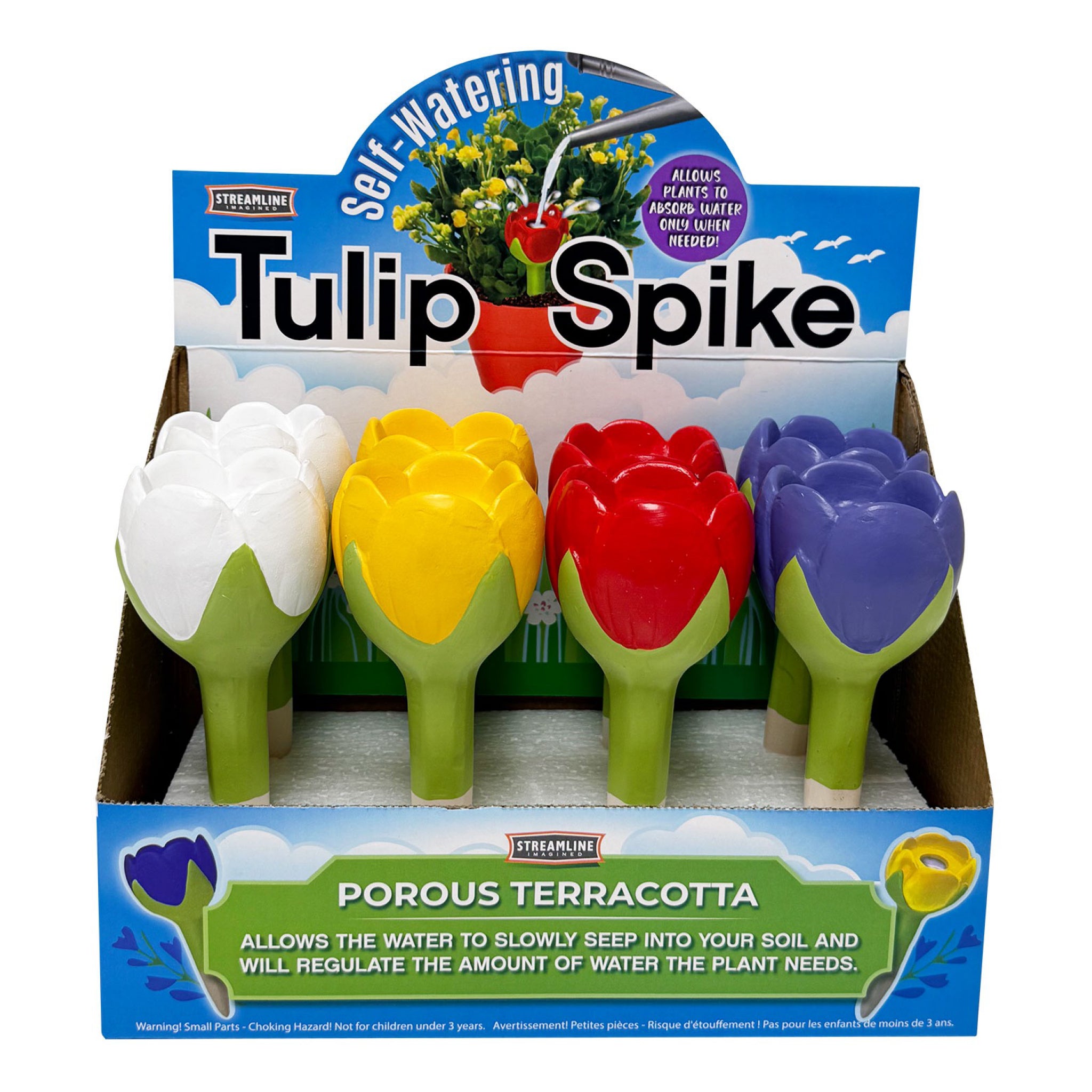 Keep thirsty pots happy with a tulip-shaped watering spike that slowly delivers water right to the roots. Choose a favorite color and add a little flower power to plant care.
