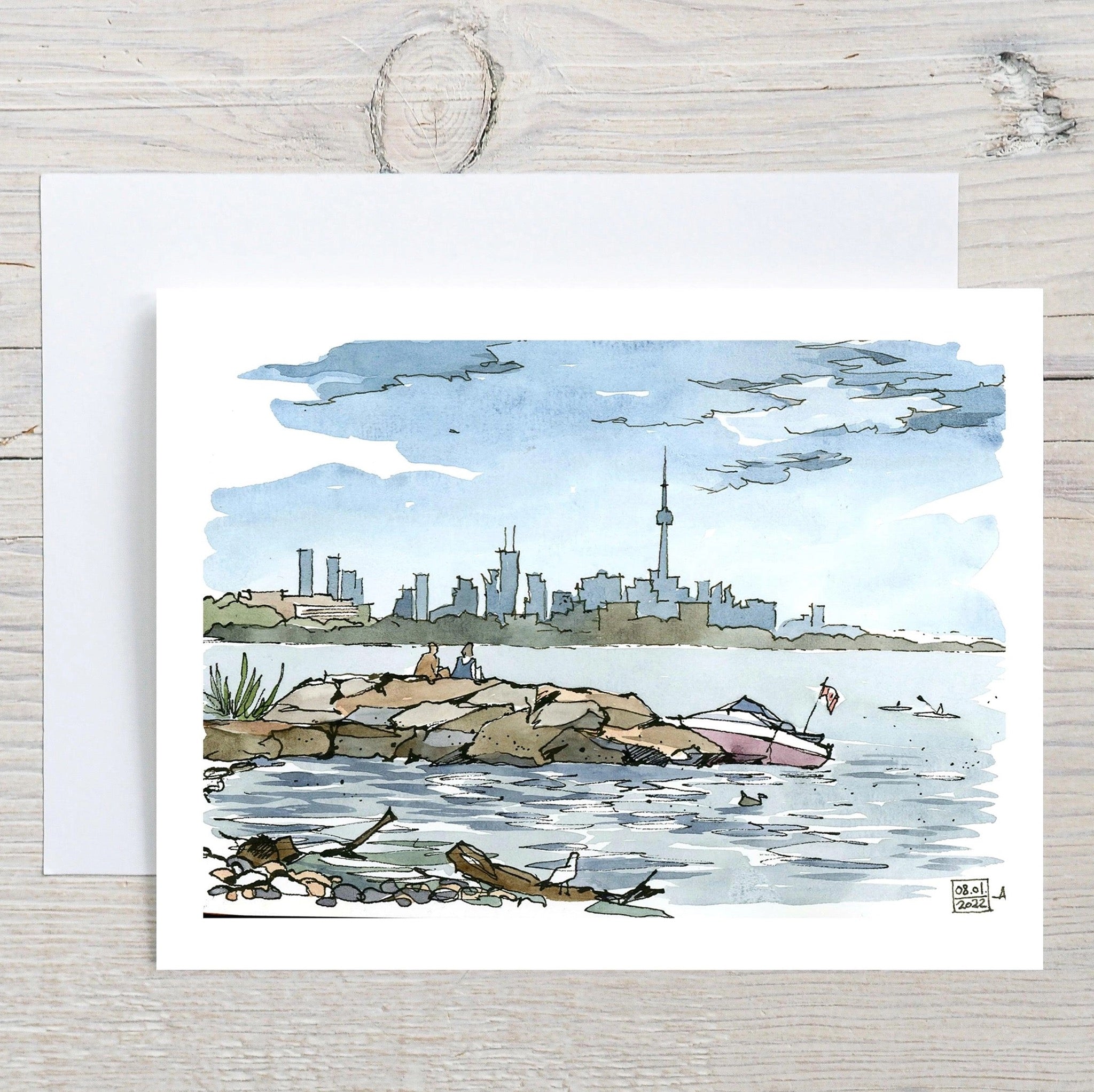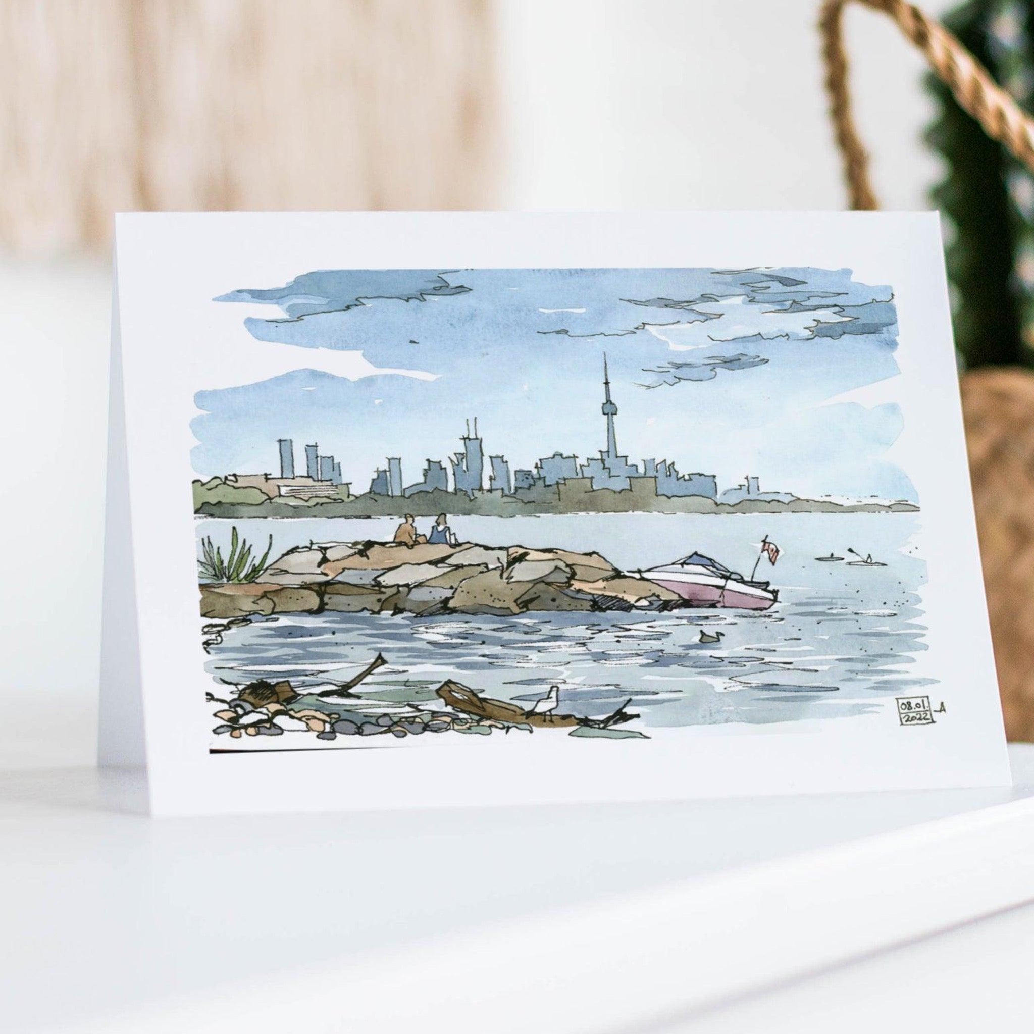 Send a little slice of lakeside Toronto. This Island View card features a gentle watercolour by Andrey Shmatnick, capturing the Toronto skyline as seen from the Islands—calm water, rocky shore, and that unmistakable city silhouette.