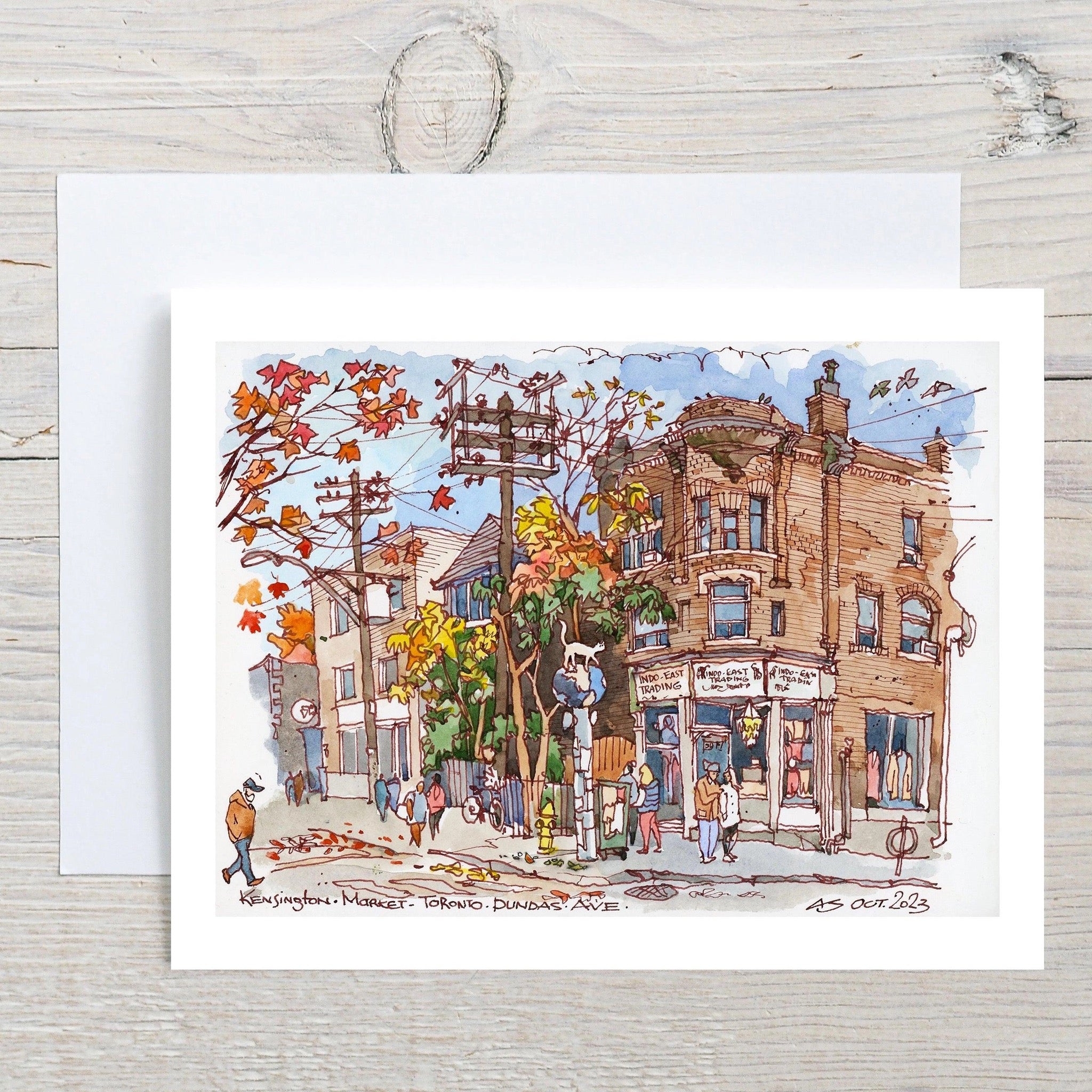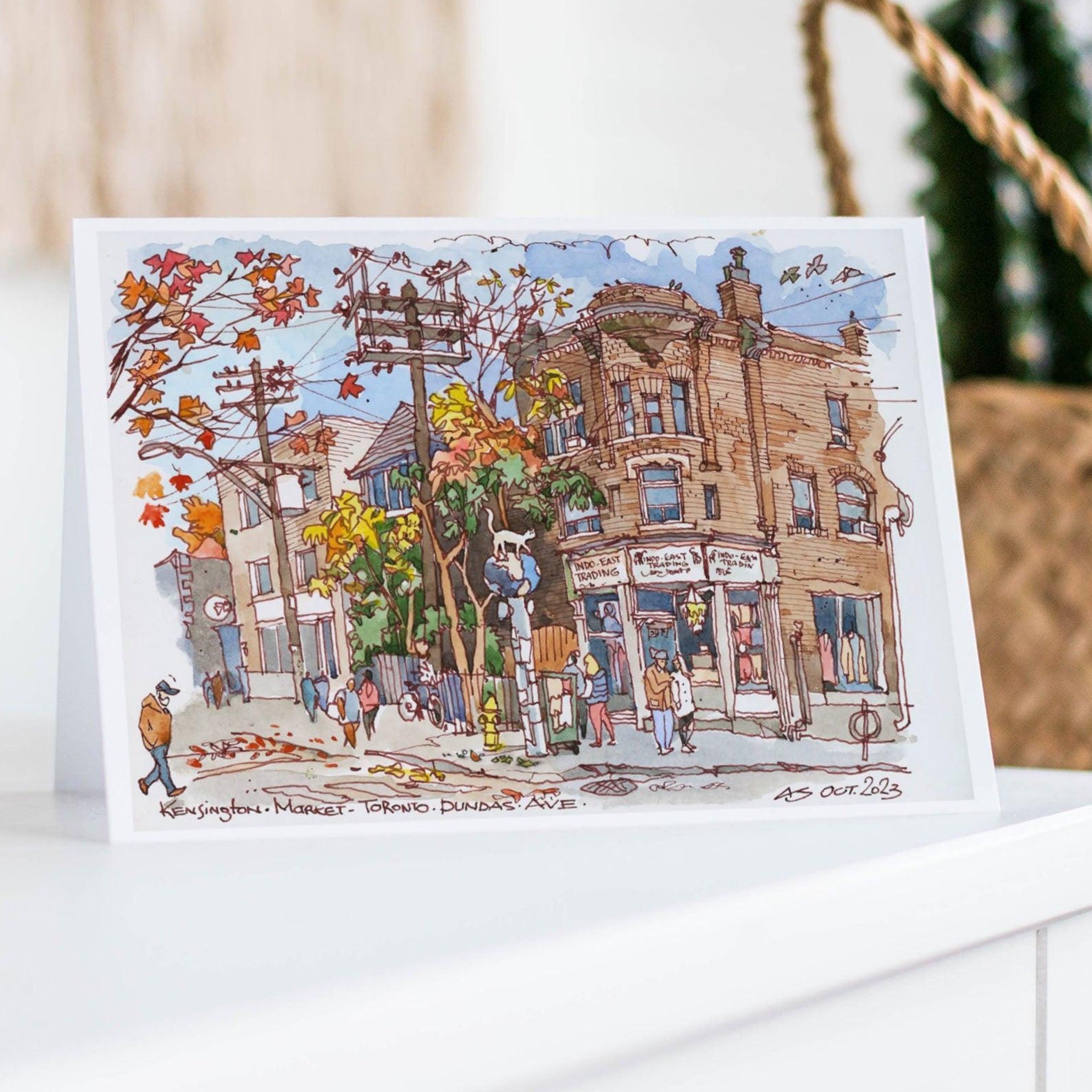A colourful Toronto greeting card featuring a watercolour of Kensington Market’s iconic globe and lively street scene, painted by Andrey Shmatnick.