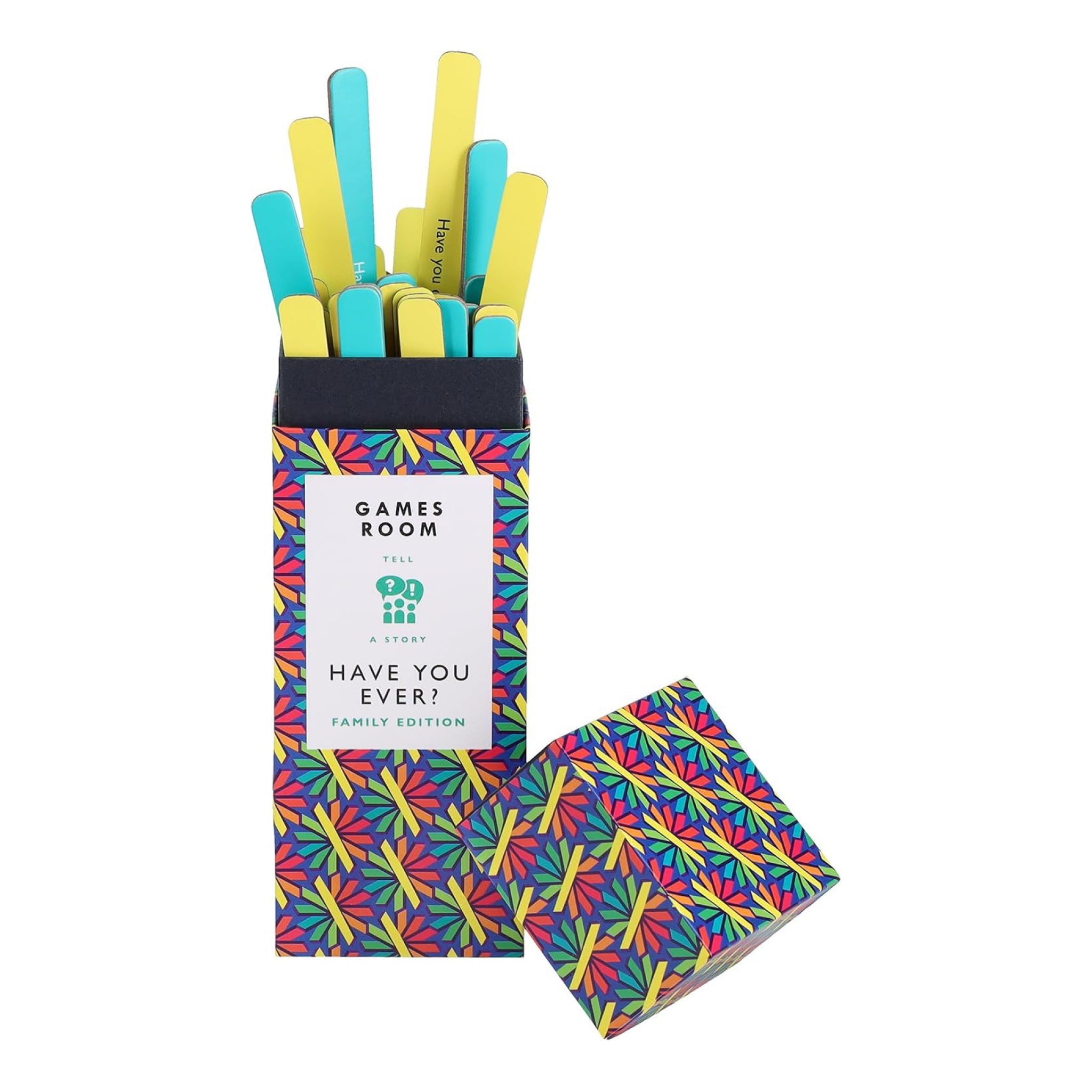 Family Have You Ever? Family Edition is a fun conversation game filled with 100 prompts on 50 double-sided sticks, designed to spark laughter and storytelling across generations. With light-hearted questions on one side and gently embarrassing ones on the other, every round uncovers new family memories and hilarious surprises.
