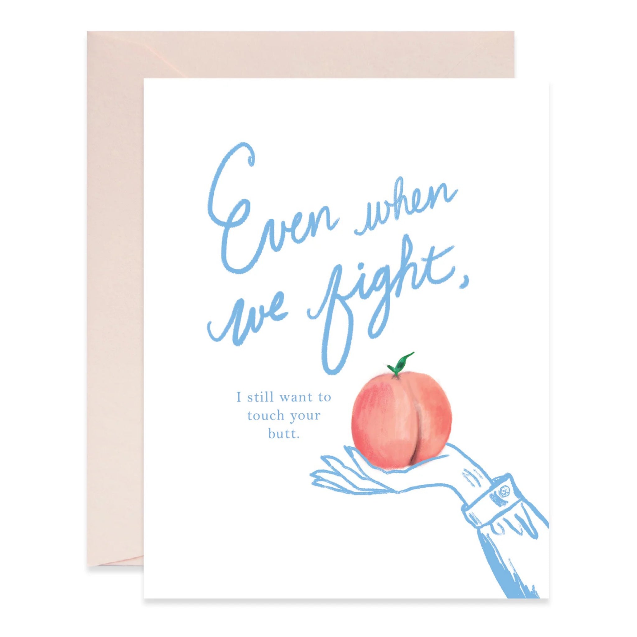 "Even when we fight, I still want to touch your butt.' A cheeky love card with soft lettering and a playful illustration that balances tenderness with humor.