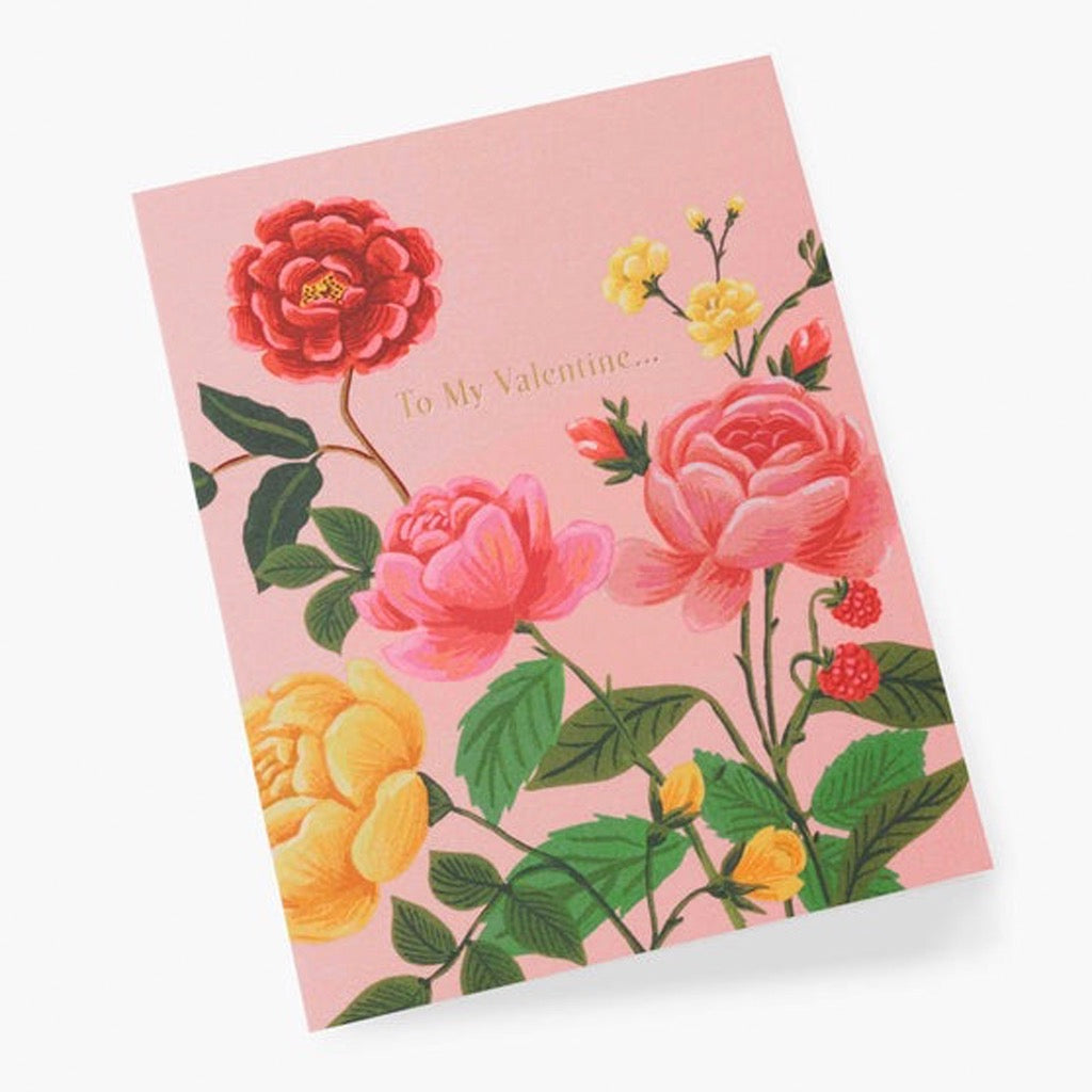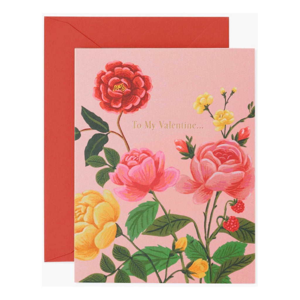 A romantic Valentine’s card featuring lush floral artwork with subtle foil details, perfect for sharing a heartfelt handwritten message.