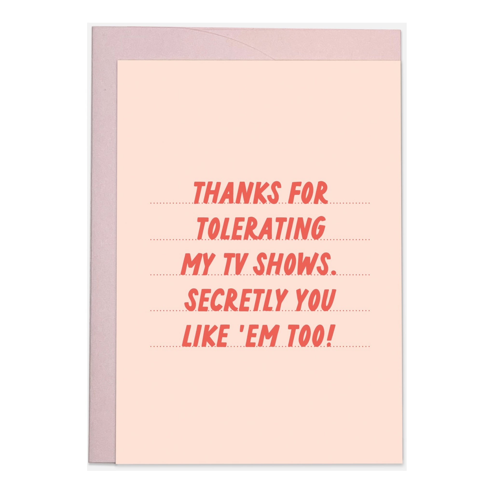 Say thanks with the Tolerate TV Shows Love Card, a playful way to appreciate your partner for sharing binge-worthy guilty pleasures.