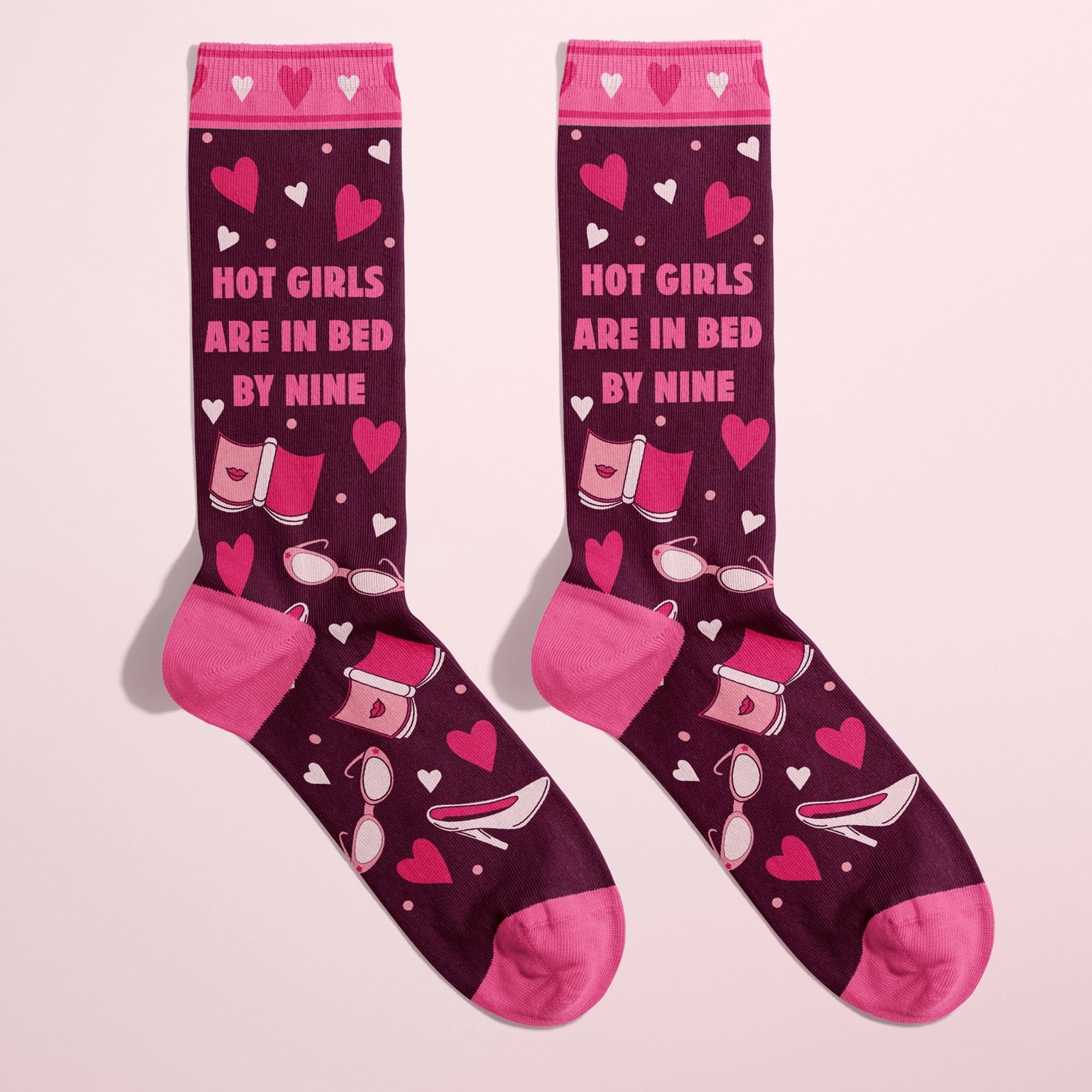 Hot Girls Are In Bed By 9 Socks are for the early-to-bed icons who choose books over bars. Cute, cozy and unapologetically well-rested.