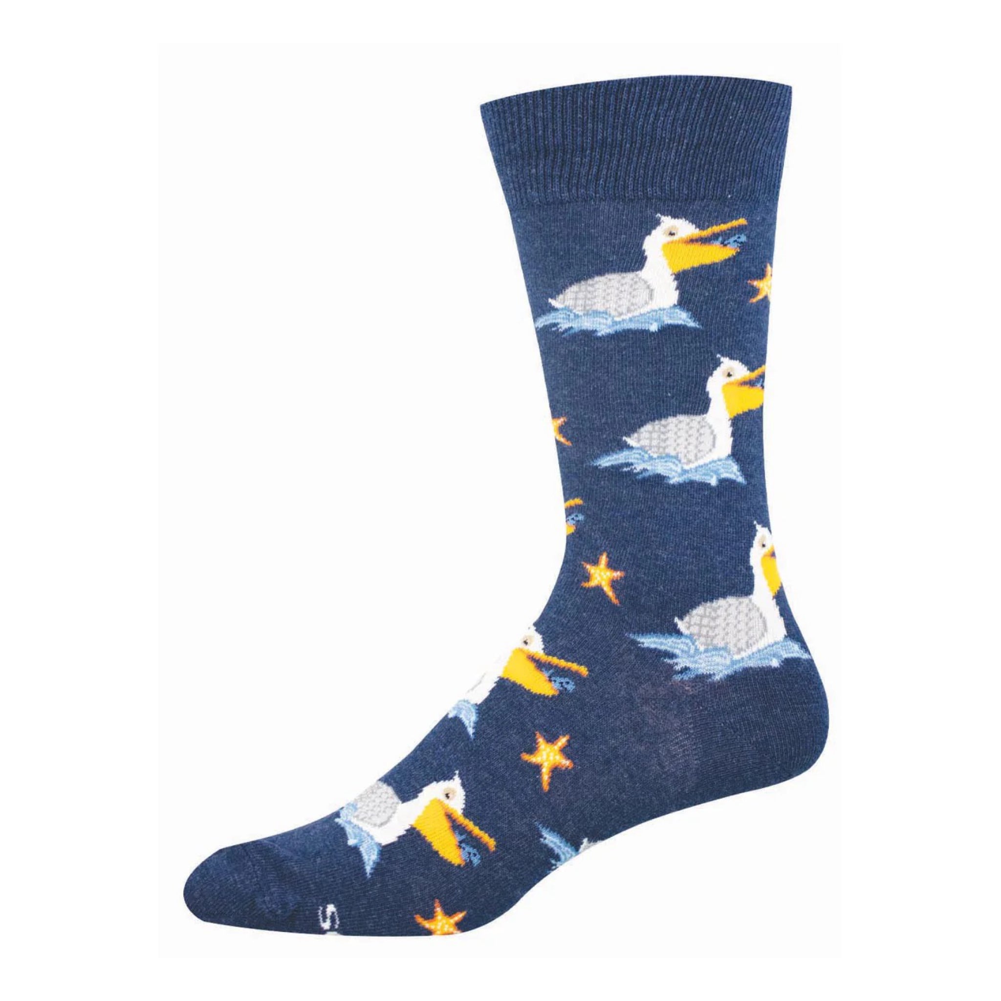 Go with the flow in navy heather crew socks featuring a hungry pelican mid catch. A playful coastal design for bird lovers and anyone happily winging it.