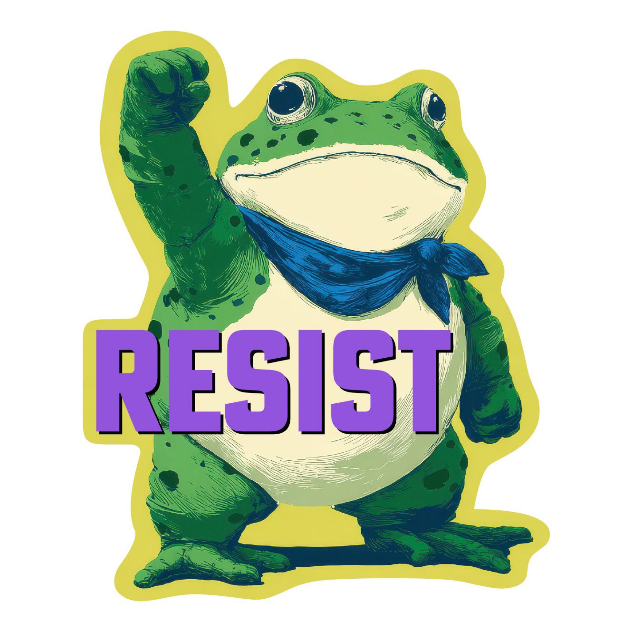 A bold sticker featuring a determined frog and “resist” message, inspired by inflatable animal costume demonstrations in Portland and made for playful, nonviolent resistance.
