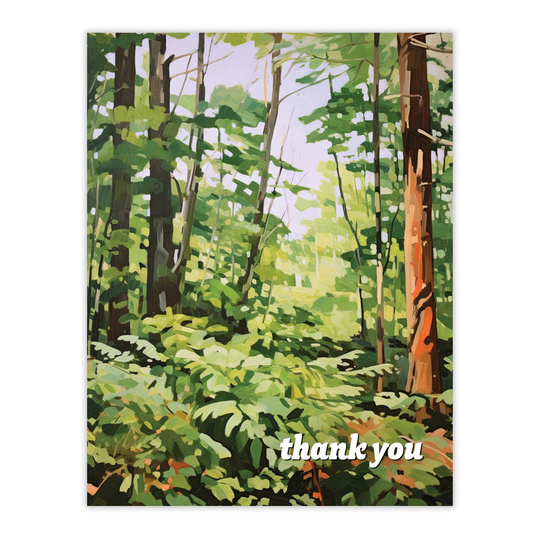 A fresh thank you card featuring a lush, sunlit forest understory scene with a simple “thank you” message on the front. Blank inside for your note.