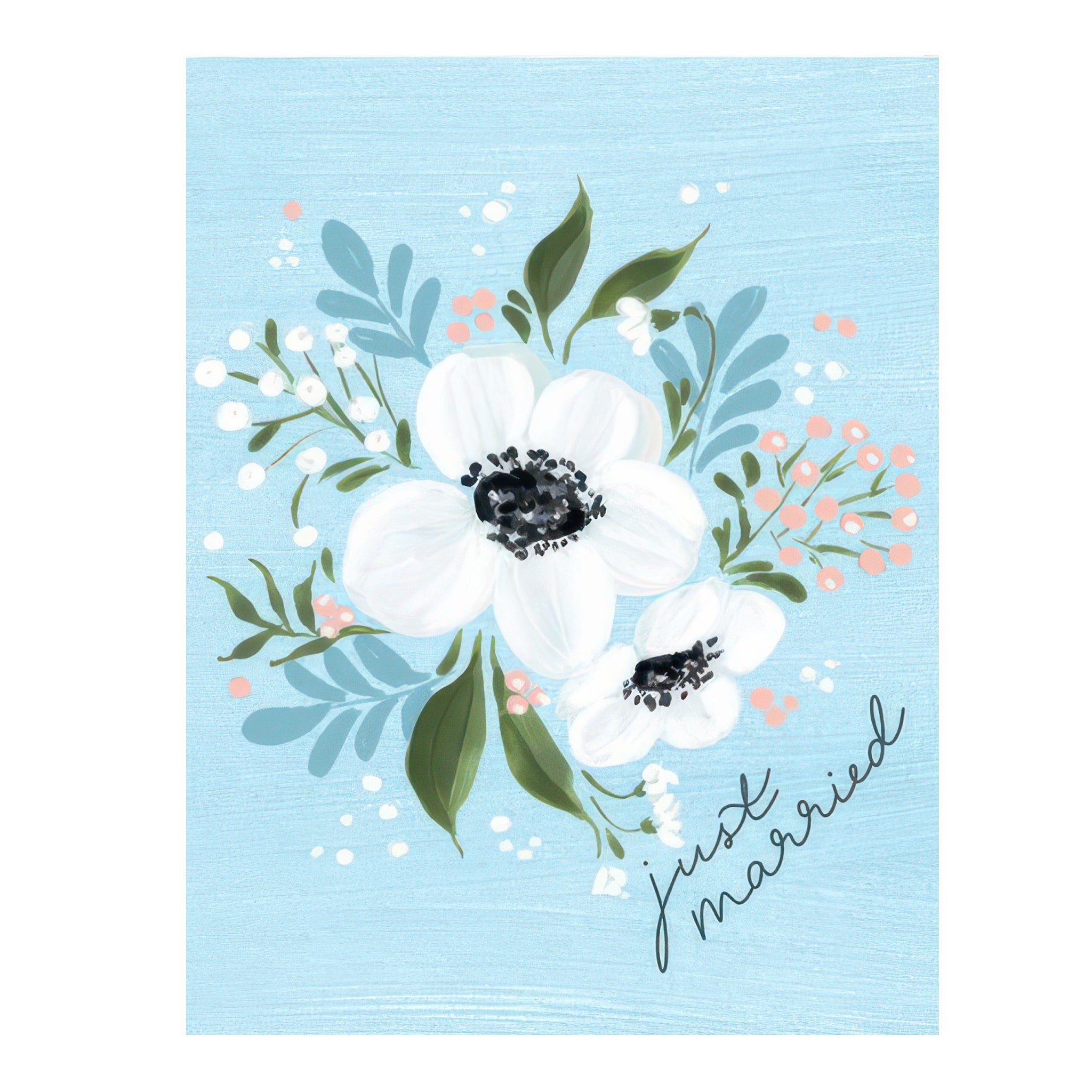 A lovely wedding card featuring elegant blue florals and the message “just married.” A thoughtful way to congratulate the newlyweds and celebrate the start of their next chapter.