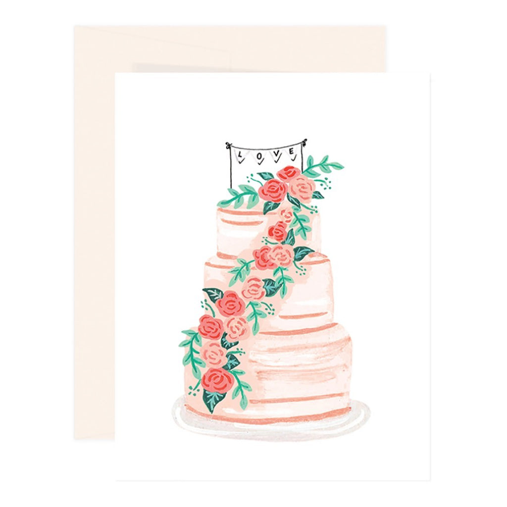 Celebrate love with this sweet illustrated wedding cake card topped with florals and a tiny love banner. Printed on thick card stock and blank inside, it includes a soft white envelope for easy gifting.
