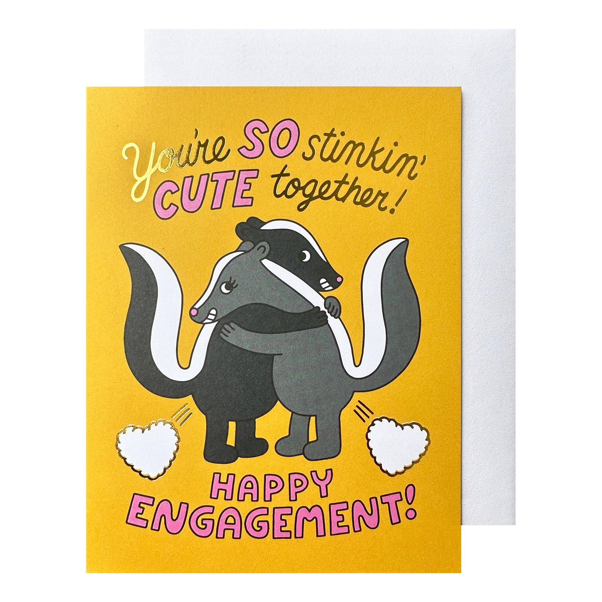 Playful engagement card with two hugging skunks and a cheeky message for the cutest couple. Blank inside for your sweet or funny note.