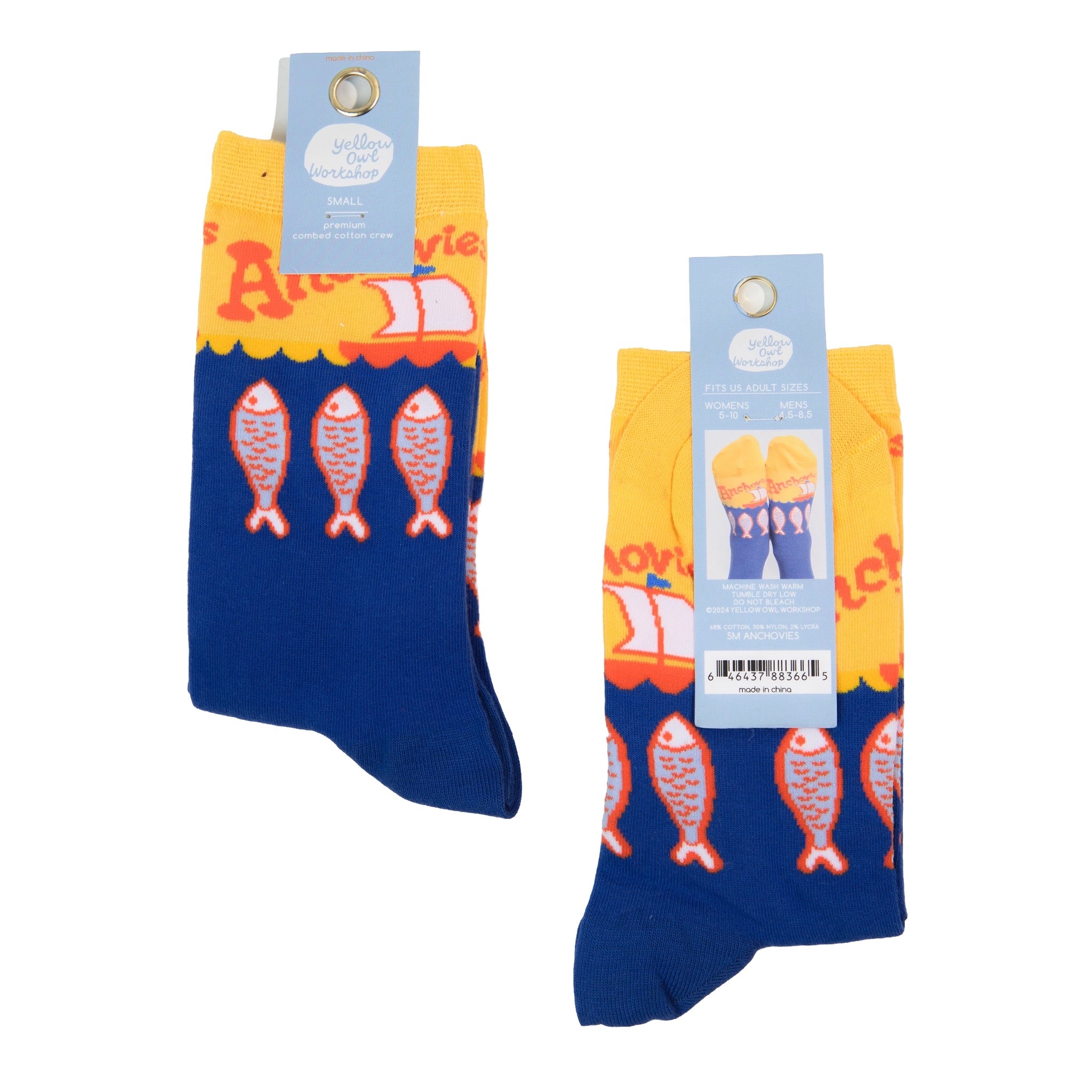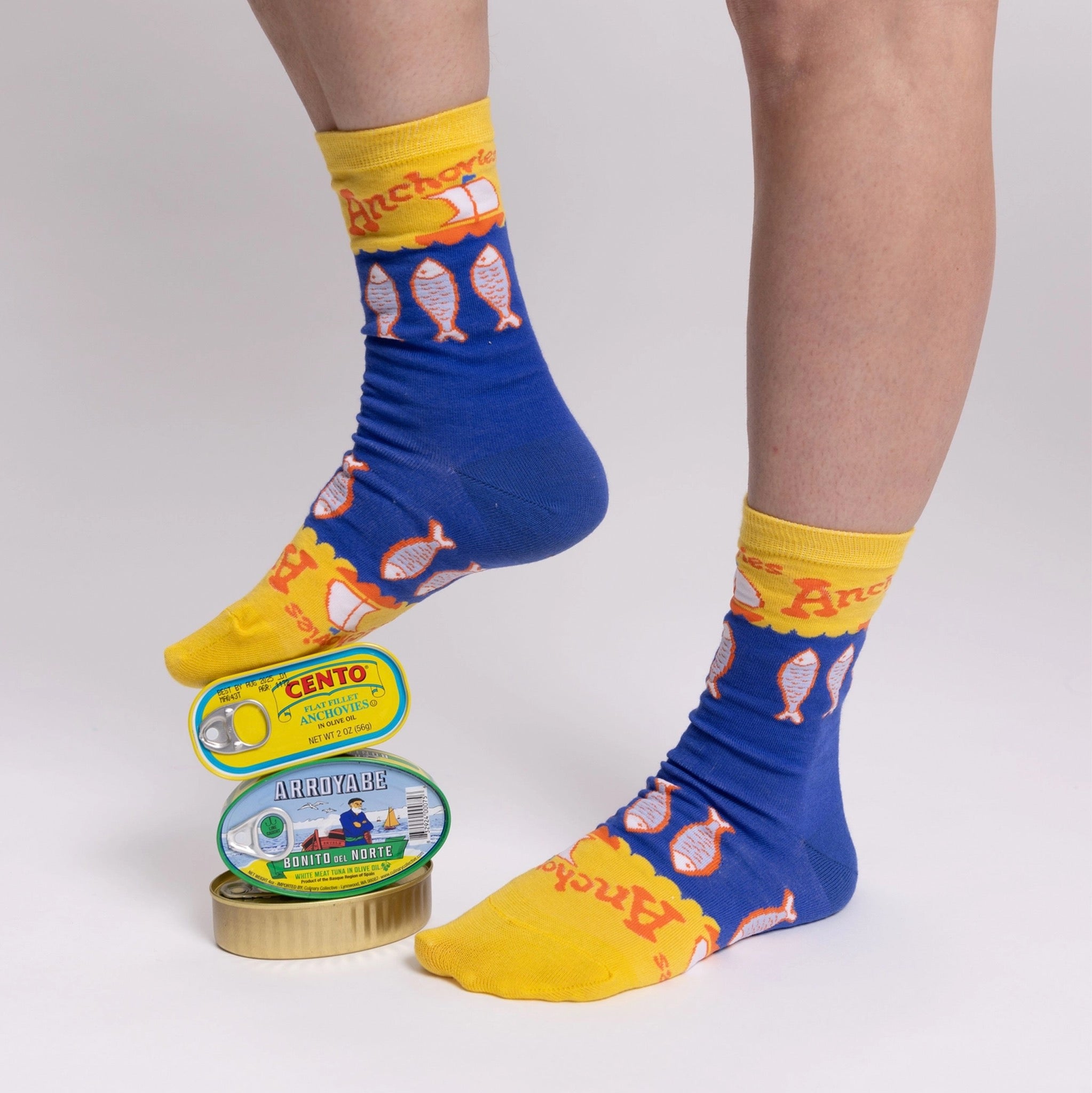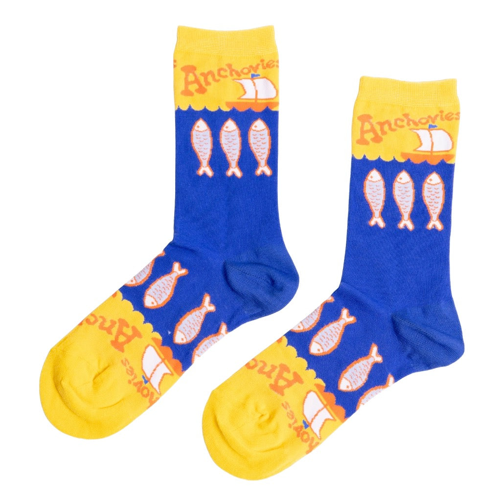Salty, snacky, and weirdly charming, these anchovies crew socks bring deli counter energy to everyday outfits. Made with premium combed cotton and bold graphics for comfy, all day wear.