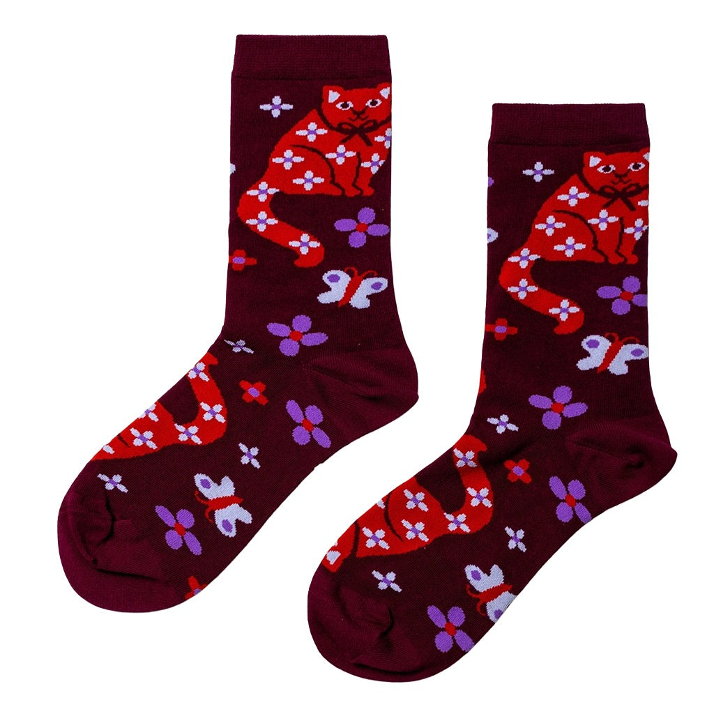 A curious cat, bright blooms, and a few fluttering butterflies make these crew socks an instant mood boost. Made with premium combed cotton for comfy, everyday wear, they are a playful pick for cat people and colour lovers alike.