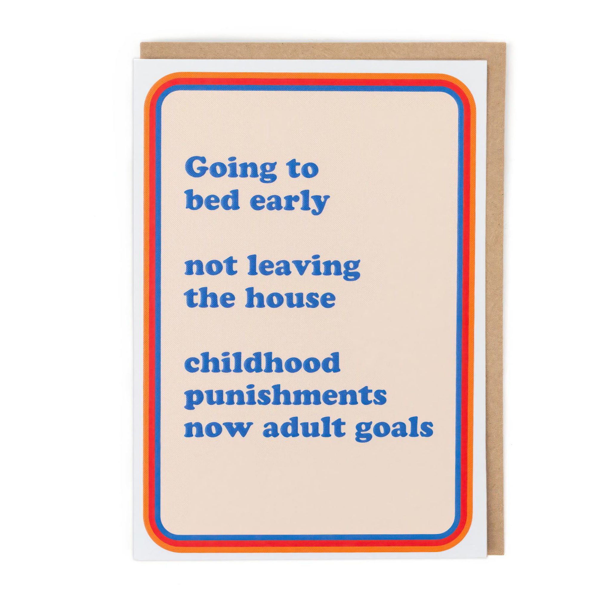 A funny reminder that growing up is weirdly rewarding. This adulting card reads “Going to bed early, not leaving the house… childhood punishments now adult goals” and is blank inside for your own message.