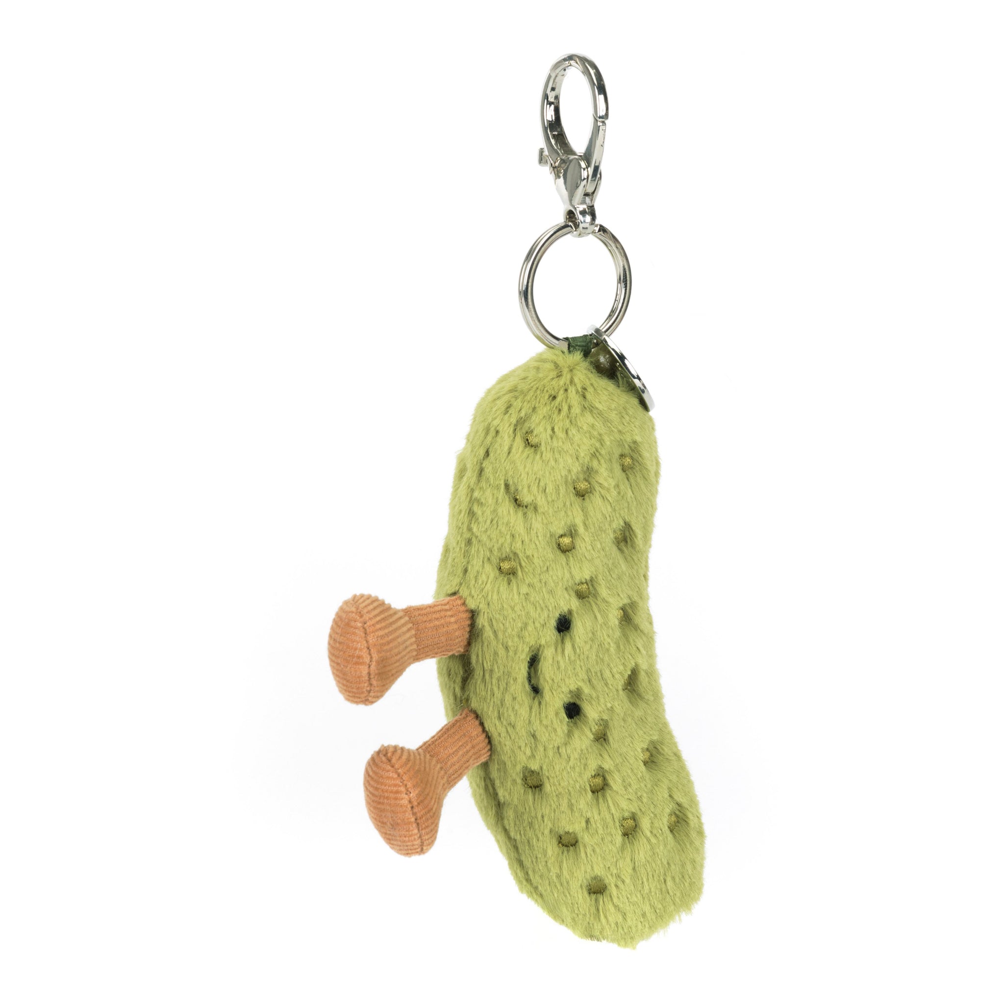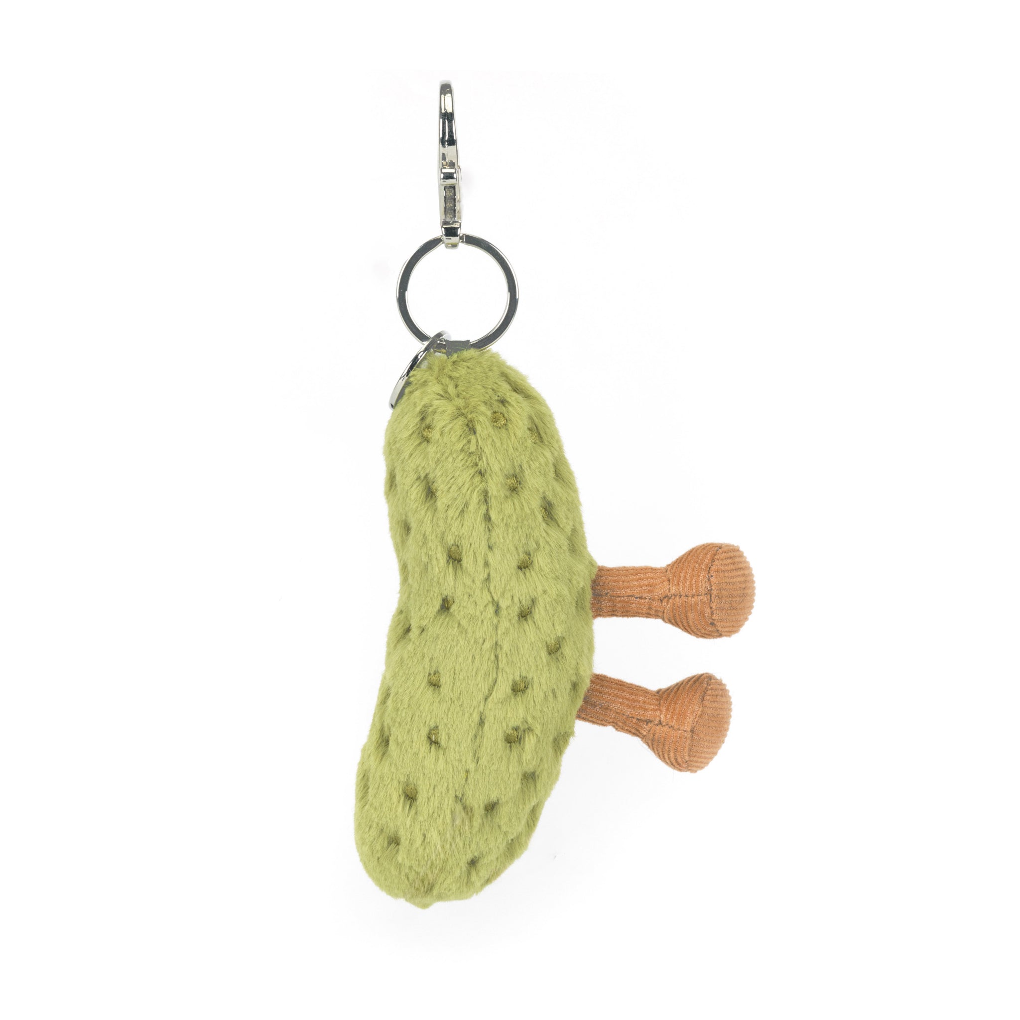 A fuzzy pickle charm with tiny legs and big sidekick energy, ready to tag along on keys, backpacks, and zippers for a little everyday chaos.