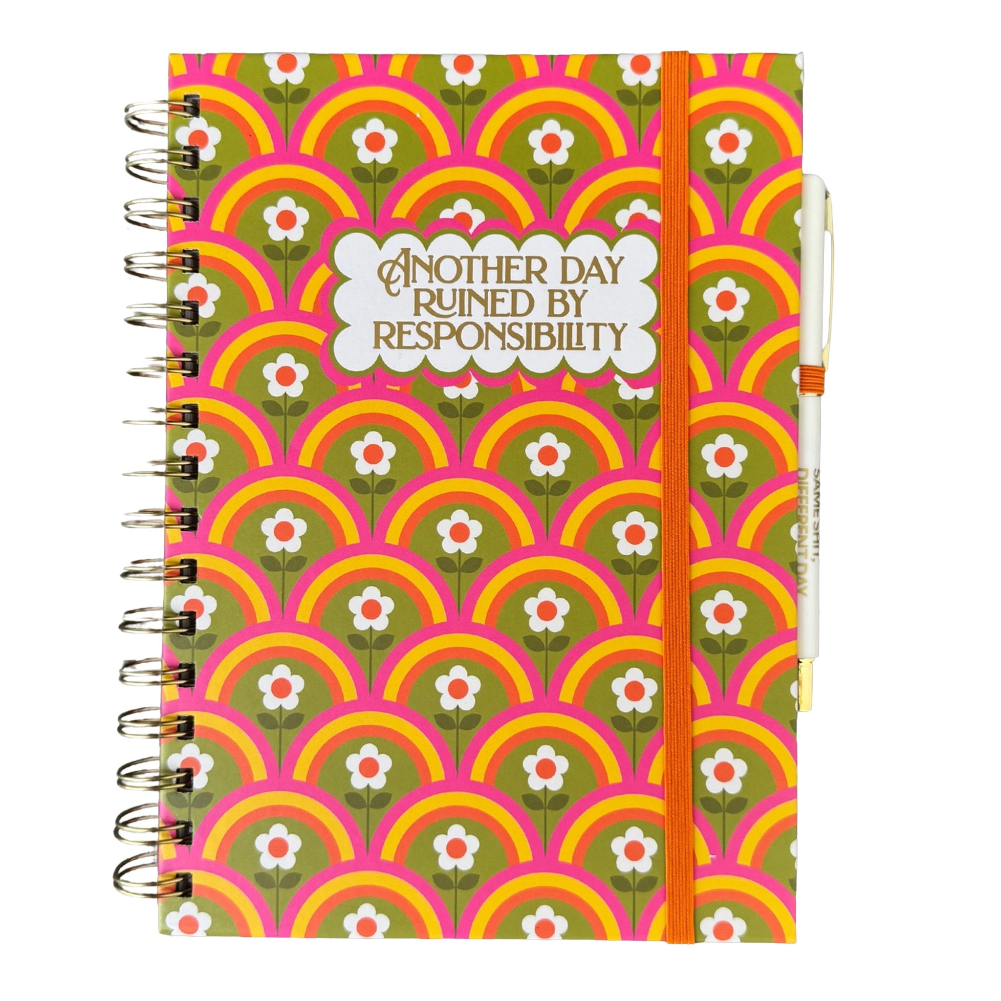 Responsibility called and this journal rolled its eyes. This hard cover notebook features artwork by Jess Miller and comes with a matching fine point ballpoint pen, ready for lists, notes, rants, and brilliant ideas on the go.