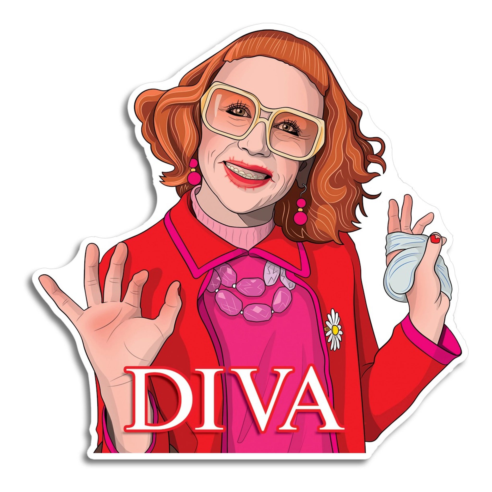 A bold die cut sticker with full diva energy and bright, campy style. Thick, durable vinyl is made to handle daily wear on laptops, bottles, and more.