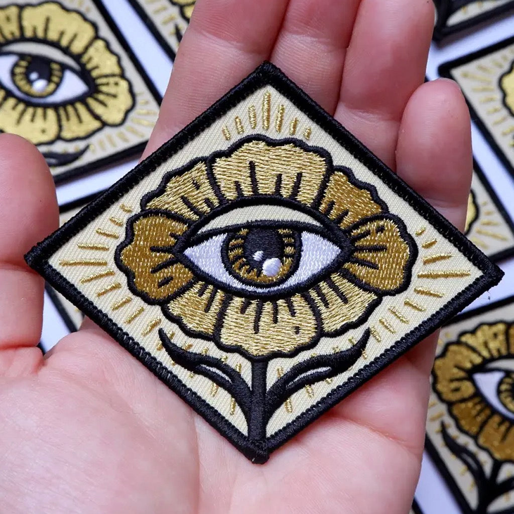 Enhance your spiritual journey with this shimmering twill embroidered patch, featuring metallic gold thread. Iron-on for easy application, but sewing edges is recommended for durability.