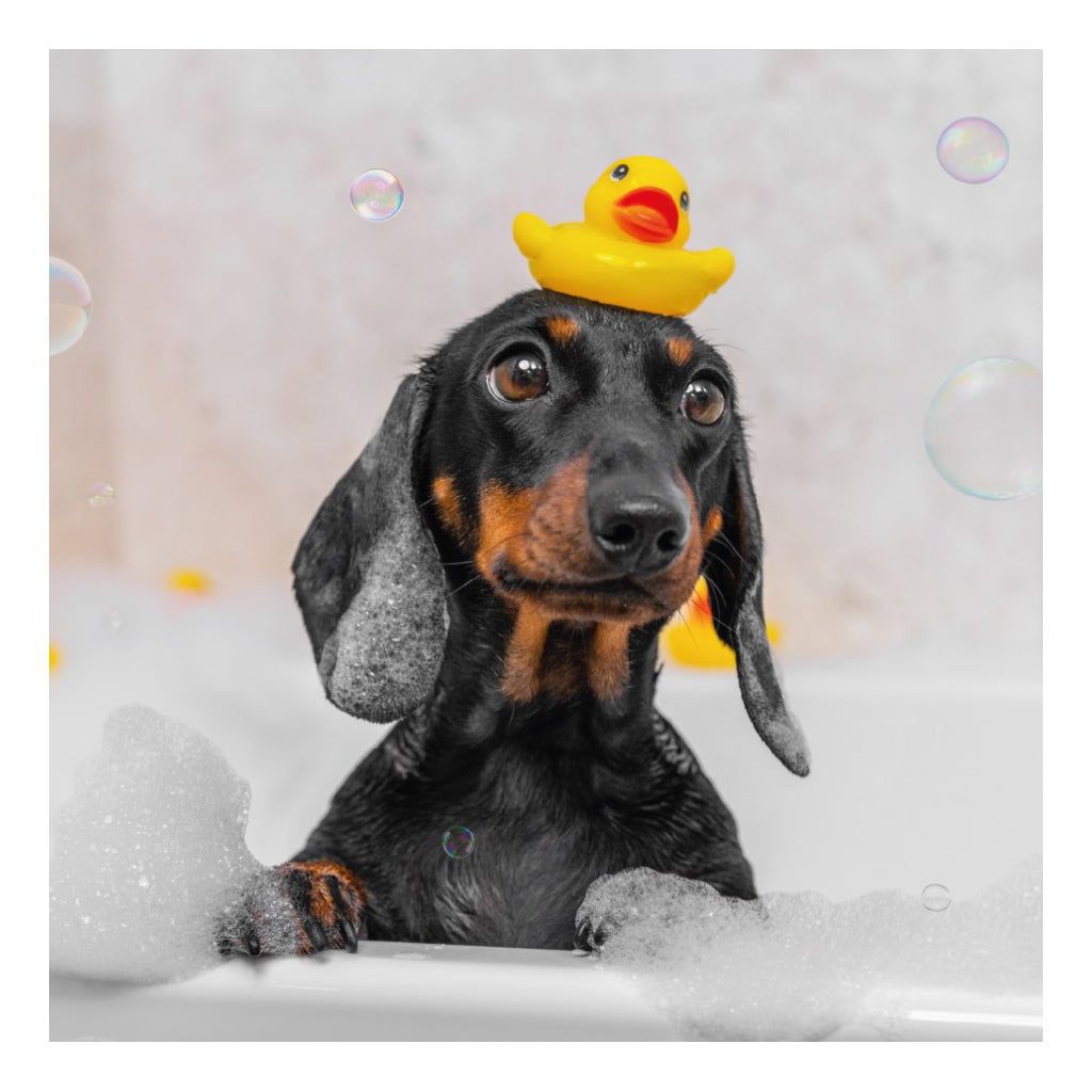 A squeaky-clean pup steals the spotlight in this adorable bath time card, complete with bubbles and a tiny rubber duck. A playful pick for birthdays, thank you notes, or just because.