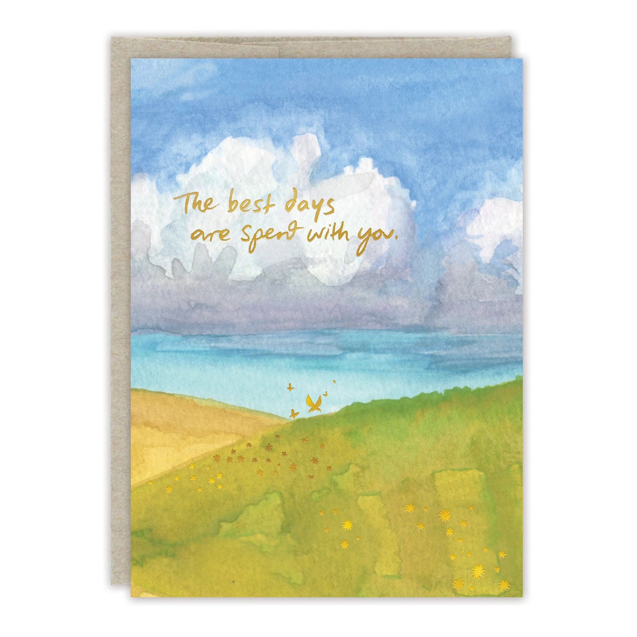 A dreamy birthday card featuring a peaceful watercolor landscape and gold foil lettering that reads “The best days are spent with you.” A thoughtful way to celebrate a favorite person.